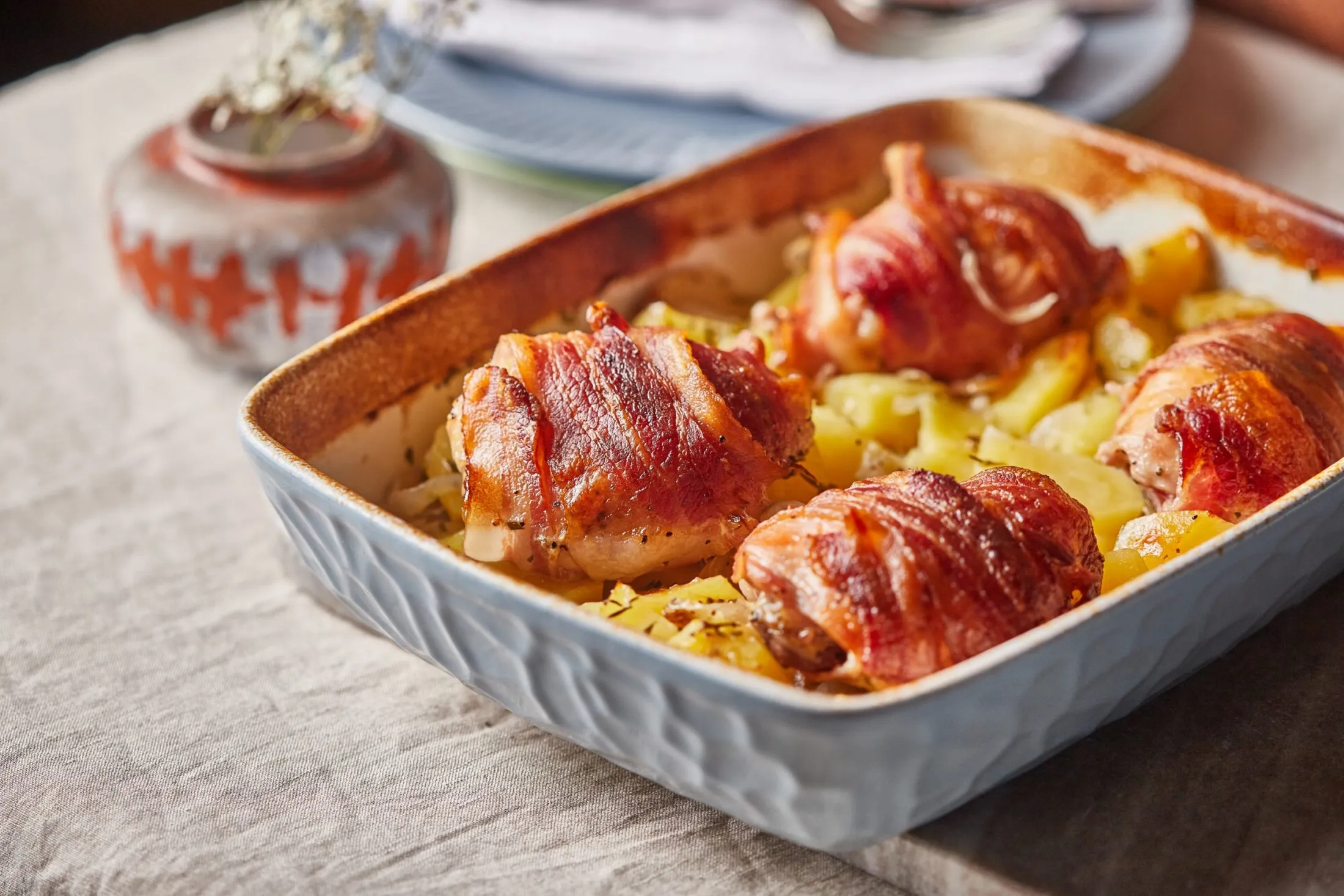 A részeges csirke elkészítéséhez a combokat sózzuk, borsozzuk, és betekerjük a baconnel. A krumplit 3-4 cm-es kockákra vágjuk, összeforgatjuk a vékonyra szeletelt hagymával, a fokhagymával, a felaprított rozmaringgal, sóval, borssal és olívaolajjal.