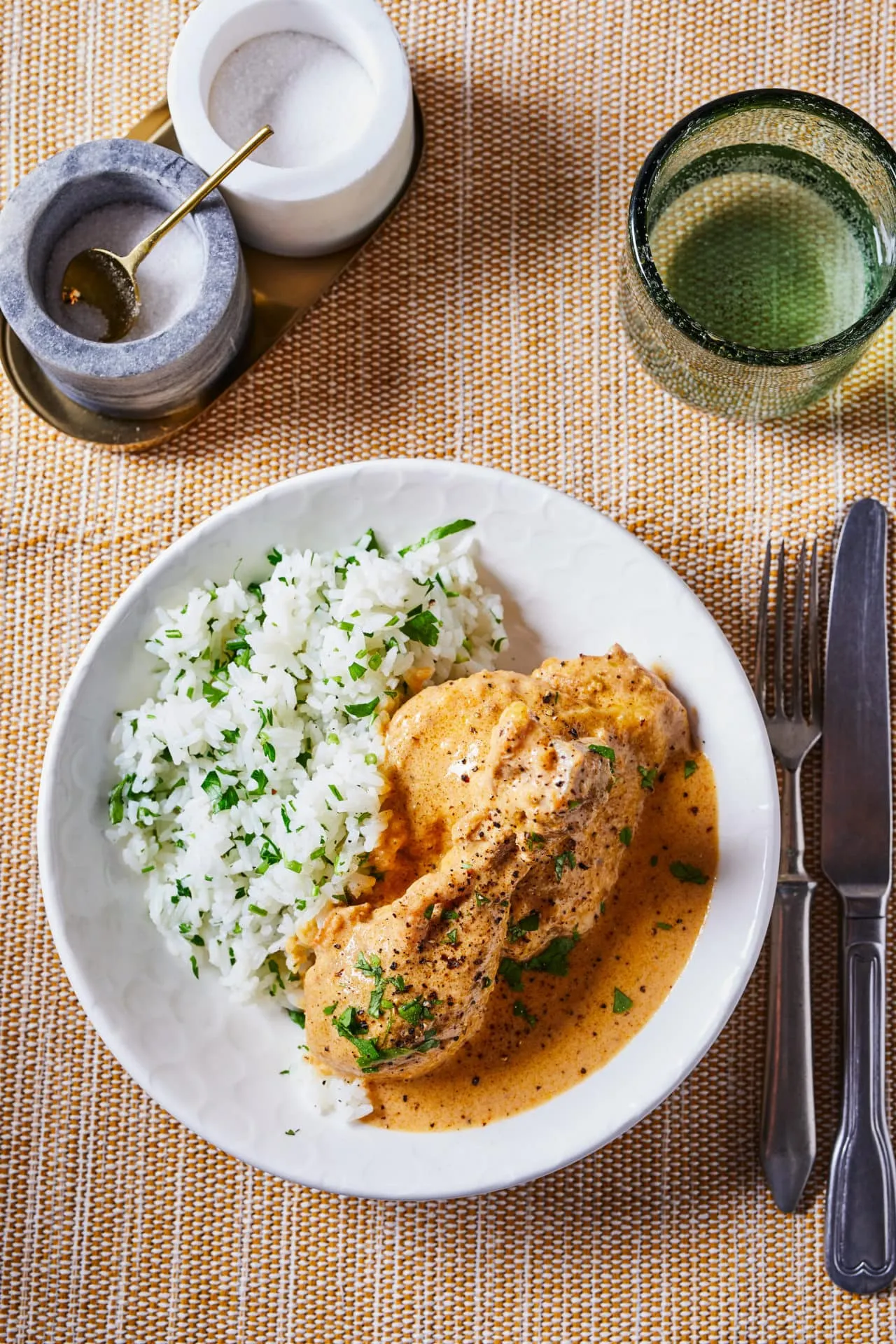 Ha majdnem omlós a hús, kiszedjük, majd az alapot az edényben botmixerrel pépesítjük. Hozzáöntjük a tejszínt, és kb. egy csapott evőkanál liszttel és 100 ml vízzel készített habarással besűrítjük, majd kiforraljuk. A combokat visszatesszük, és lassú fokozaton összeforraljuk. Ideális köret hozzá a párolt rizs vagy a főtt tészta.