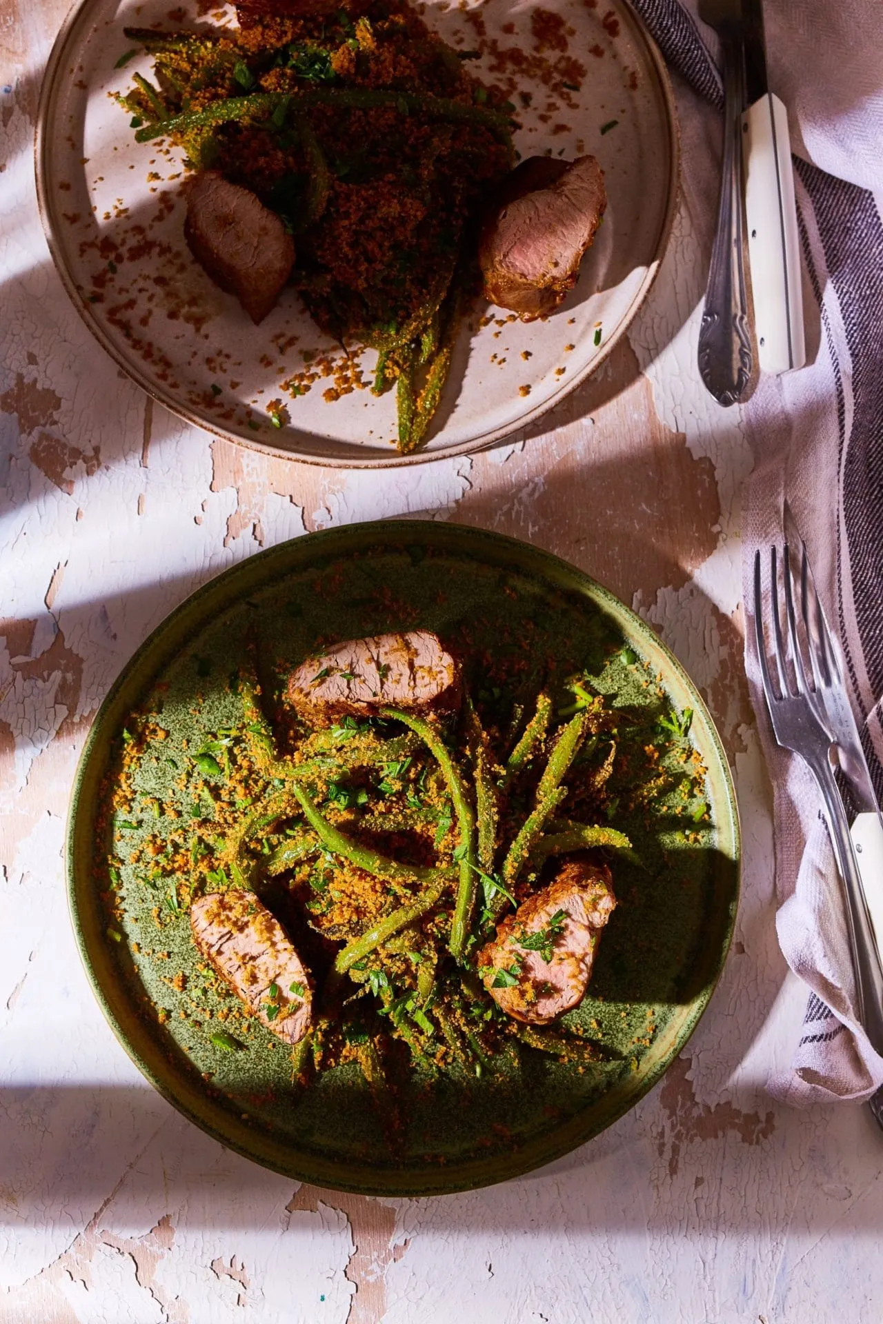 A zöldbabot sós vízben megfőzzük (ügyeljünk rá, hogy ne főzzük túl, 2-3 perc elég is neki), majd hideg víz alatt lehűtjük. A vajat felolvasztjuk egy serpenyőben, átforgatjuk rajta a zöldbabot, és sózzuk, borsozzuk. Egy száraz serpenyőben lepirítjuk a zsemlemorzsát. Ezzel, illetve a felaprított petrezselyemmel megszórjuk a babunkat.