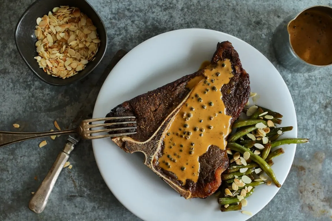 Jani - Flambírozott T-Bone steak, ceruzababbal és zöldborsmártással: Itt a recept!