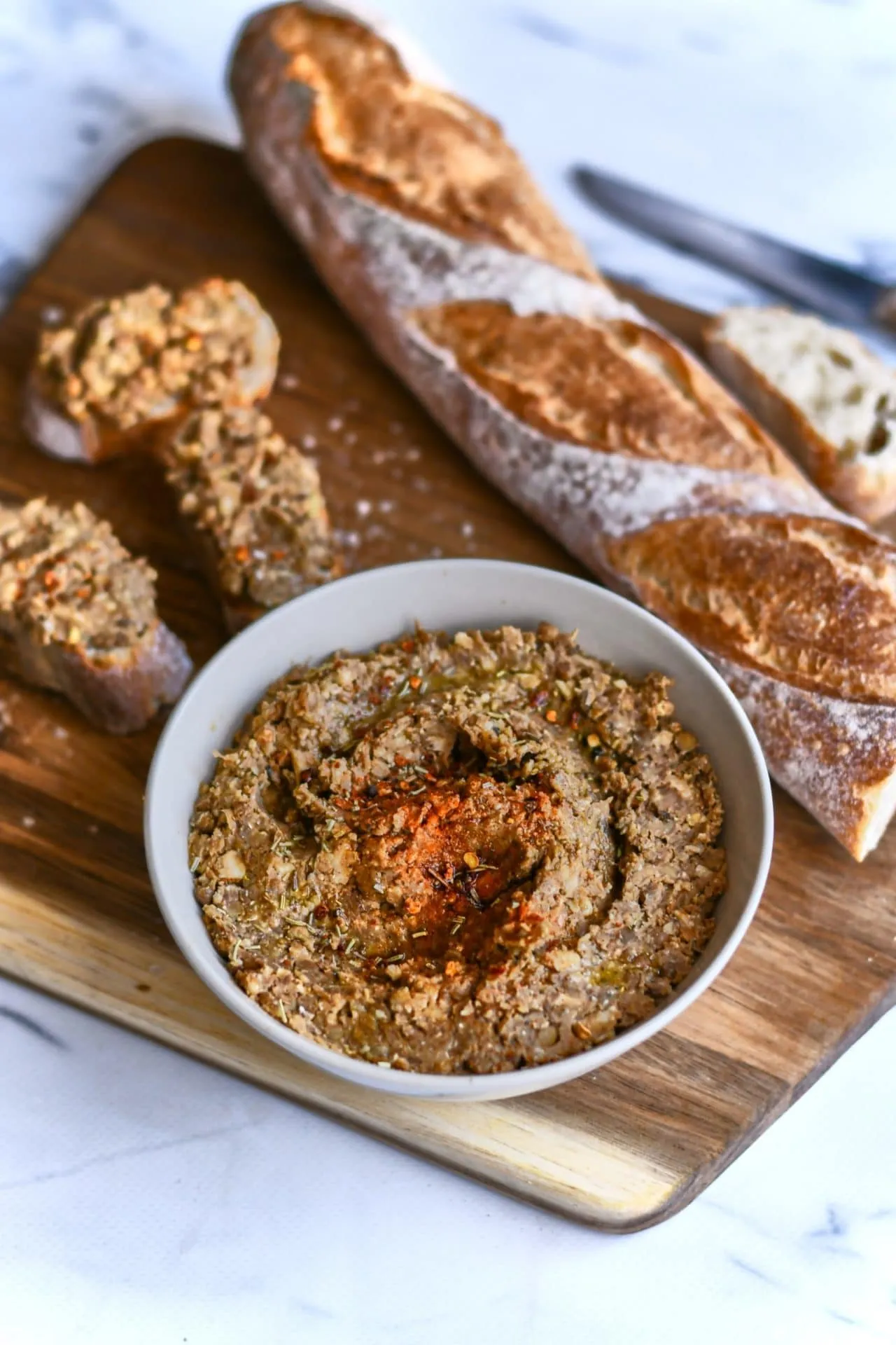 A hagymát és a fokhagymát apróra vágjuk, és egy serpenyőben üvegesre pirítjuk egy kevés olajon. A lencsét leszűrjük, és egy aprítóba rakjuk a dióval és a hagymával együtt, majd alaposan lezúzzuk. Az olívaolajból először csak 1 evőkanállal adjatok hozzá. Hagyhatjuk kicsit rusztikusabb állagúra is, mint ahogy a képen van, de ha krémesebbre szeretnétek, adhattok hozzá még olívaolajat, és újból átzúzhatjátok.