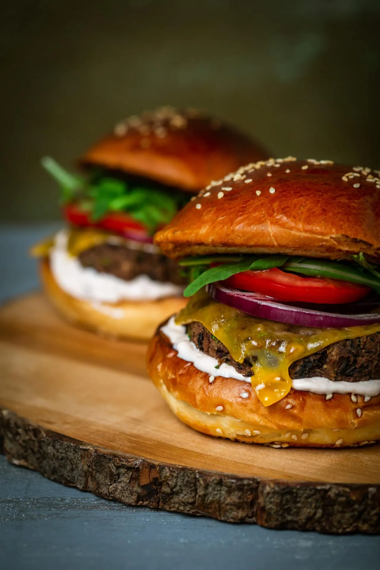 Az olajon az apróra vágott vörös és fokhagymát lepirítjuk, közben szintén apróra vágjuk a gombafejeket is, majd ez is mehet a hagymákhoz. Sózzuk, borsozzuk, és ha a gomba is kissé összeesett, elzárjuk a serpenyő alatt a lángot. A babkonzervet leszűrjük, majd a babot villával rusztikusra törjük. Mehet hozzá a gombás - hagymás alap, apróra vágott petrezselyem, tojás, zsemlemorzsa és az oregáno is. Alaposan összedolgozzuk, majd 4 részre osztjuk, hamburgepogácsa alakúra formázzuk és sütőpapíros tepsin, 180 fokos sütőben kb. 15 perc alatt készre sütjük őket, és még forrón rádobunk mindegyikre 1-1 szelet sajtot. A mártás hozzávalóit összekeverjük, a hamburgerzsemléket pedig félbevágjuk, és egy száraz serpenyőben lepirítjuk a vágott felüket. A zsemlék aljára jöhet egy kis mártás, rá a hamburgerpogácsa, paradicsom, hagyma, rukkola, majd a zsemlék tetejével zárjuk a sort.