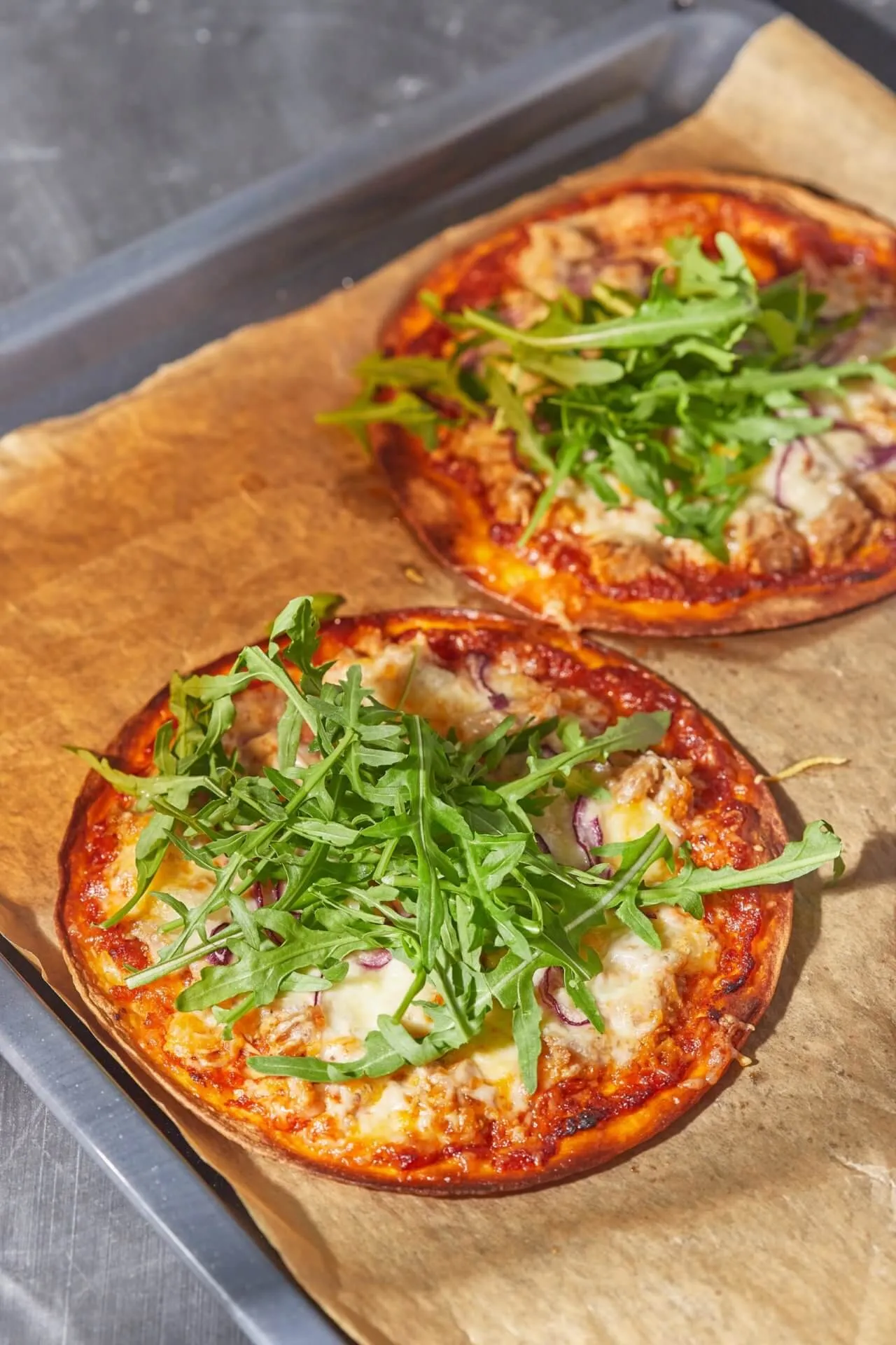 A tortillalapokat megkenjük a pesztóval, ráhalmozzuk a lecsepegtetett tonhalat, ráreszeljük a sajtot, megszórjuk a vékony szeletekre vágott lila hagymával, és 200 fokra előmelegített grillsütőben addig sütjük (kb 8-10 perc), amíg meg nem pirul a sajt. Rukkolával tálaljuk.