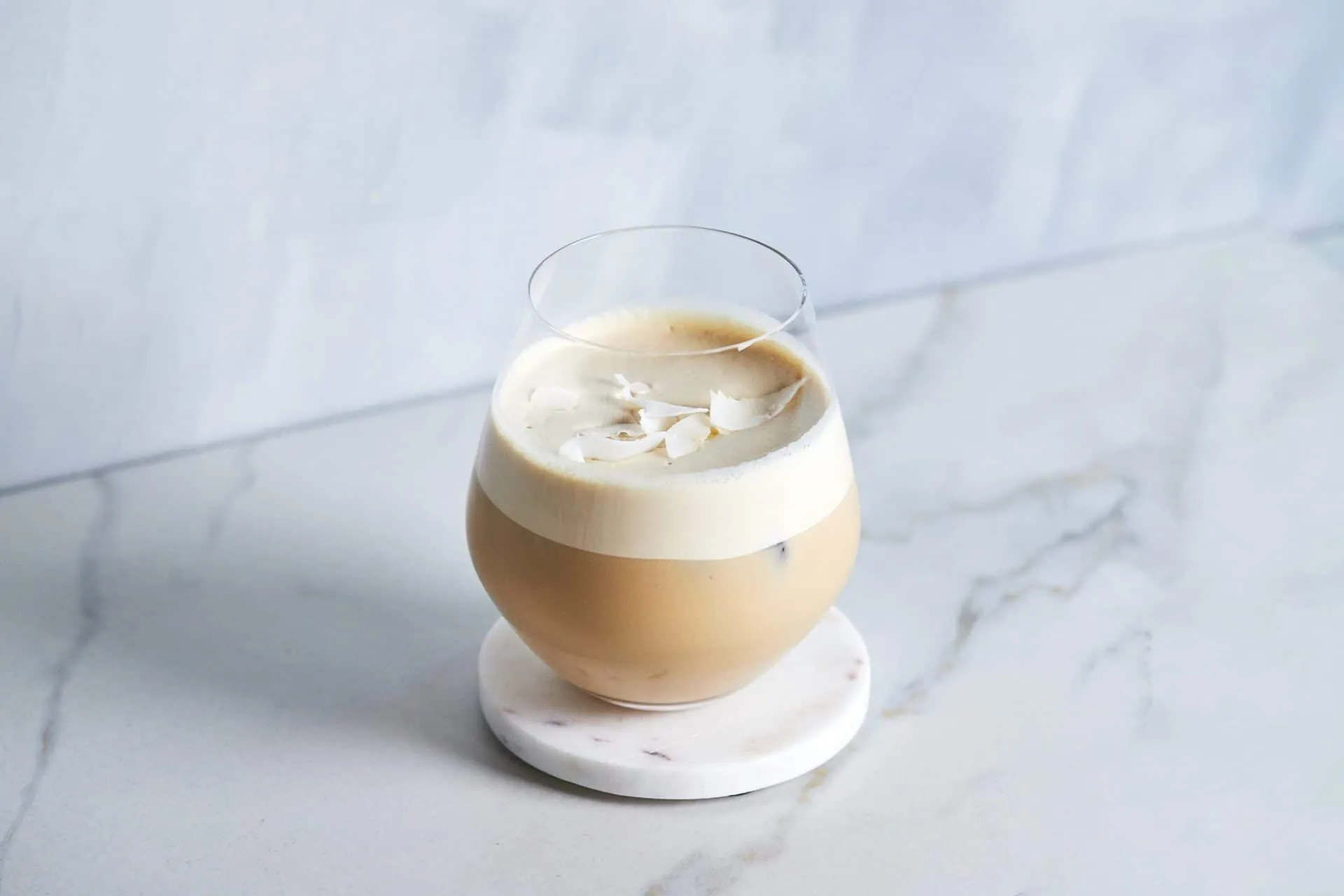 A kókuszos jegeskávéhoz a tejet, a kókuszpelyhet és a kókuszlikőrt 60-70 fok közé melegítjük, ezután belekeverjük az instant kávét és a cukrot, majd a french pressbe szűrjük. Pumpáló mozdulatokkal kb. a duplájára krémesítjük, habosítjuk a kávét, majd átöntjük egy shakerbe, és néhány jégkockával összerázva lehűtjük. Egy pohárba teszünk pár darab jégkockát, és szervírozzuk is a kávénkat. Ha szeretnénk, pár darab kókuszpehellyel díszíthetjük.