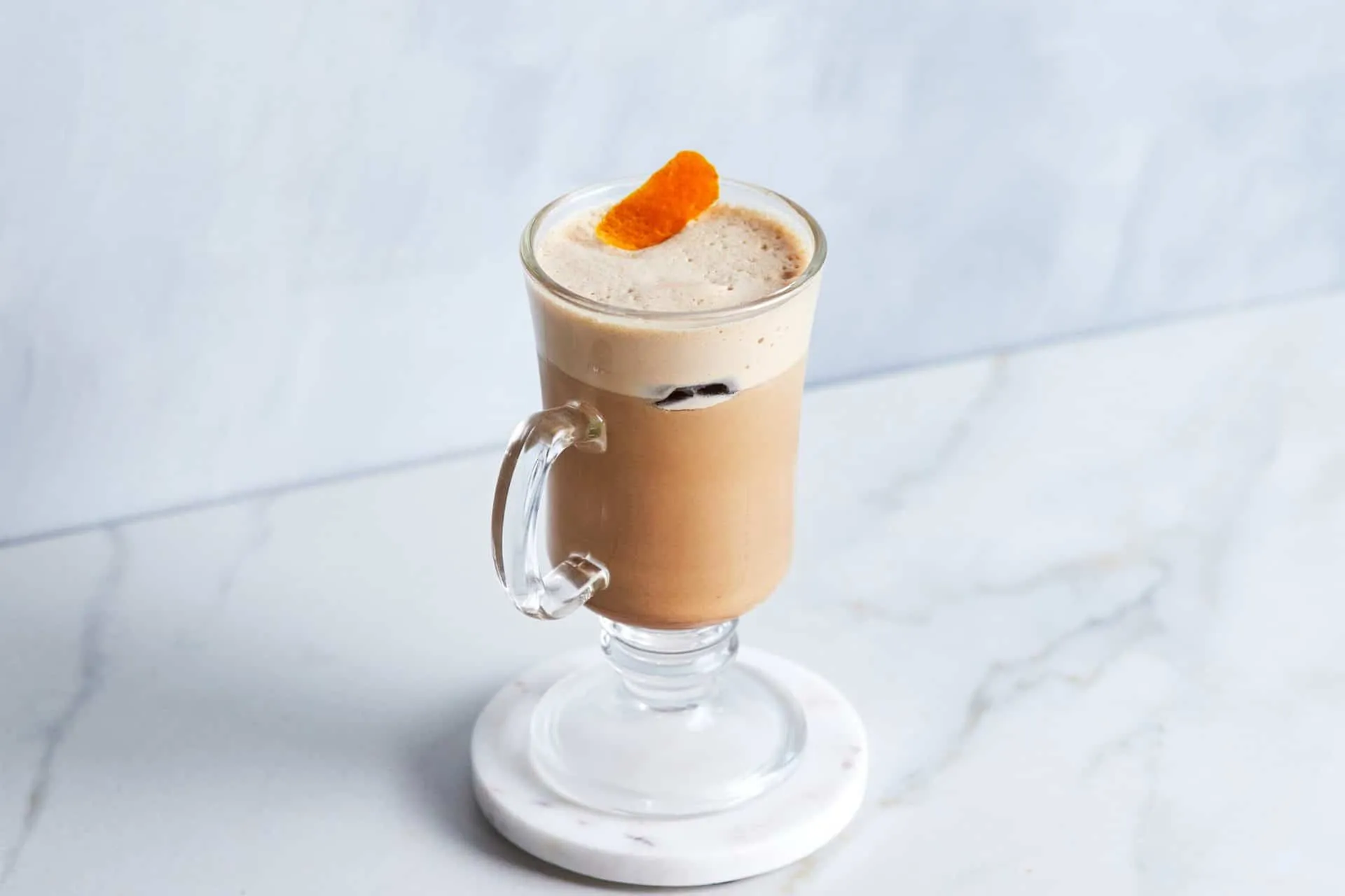 A csokis-narancsos kávéhoz a tejbe rakjuk a hámozóval lehúzott narancshéjakat, és 60-70 fok közé melegítjük. Félrehúzzuk, majd beletesszük a csokit, az instant kávét és a cukrot, elkeverjük, az egészet a french pressbe szűrjük, majd pumpáló mozdulatokkal kb. a duplájára krémesítjük, habosítjuk a kávét. Ezután átöntjük egy shakerbe, és néhány jégkockával összerázva lehűtjük a kávénkat. Ízlés szerinti mennyiségű jeget rakunk egy pohárba, majd beletöltjük a jegeskávét.