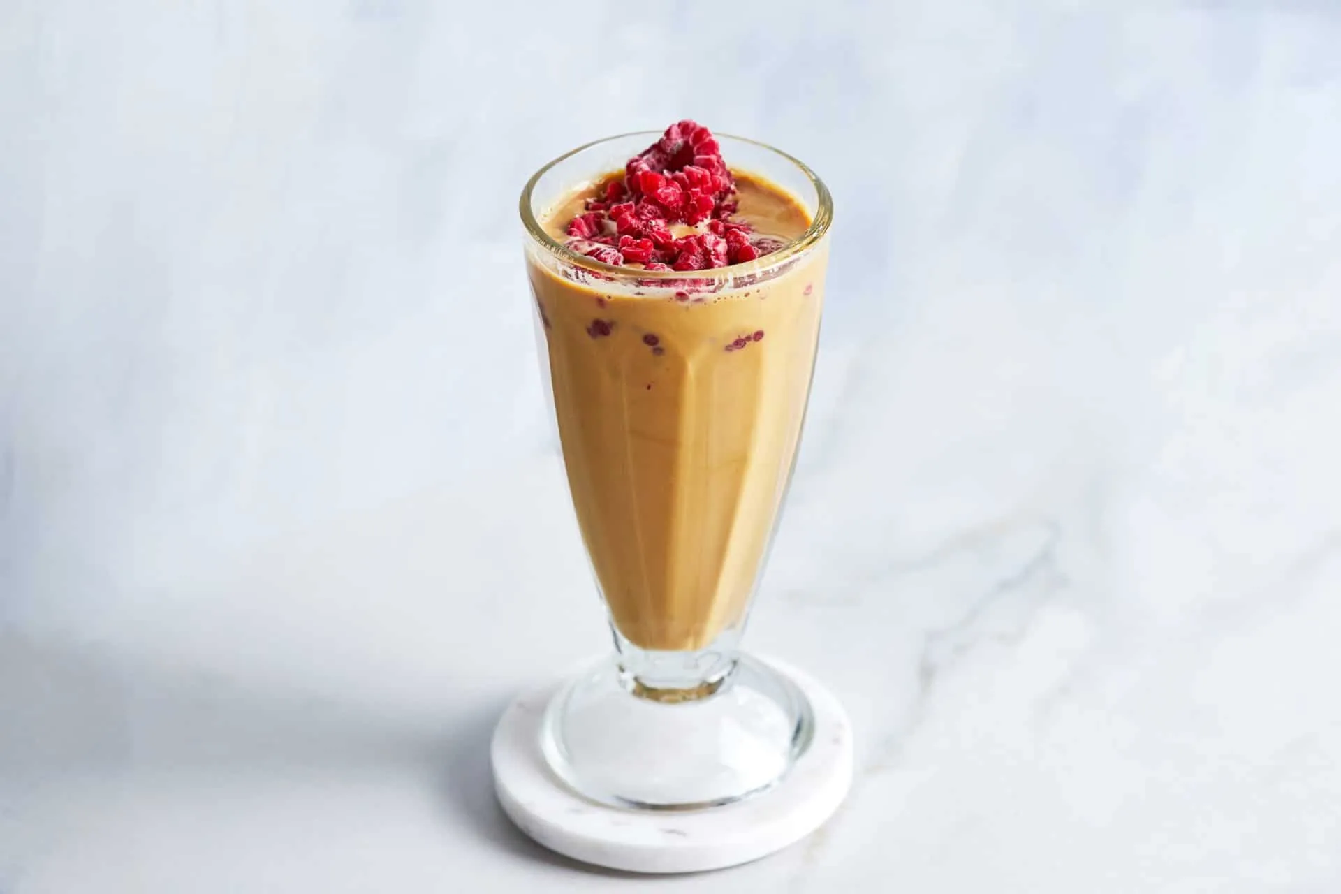 A karamellás-málnás kávéhoz a cukrot közepes hőmérsékleten addig melegítjük, amíg sötétbarna karamell nem lesz belőle (nem kavarjuk meg), majd félrehúzzuk, és hagyjuk egy kicsit hűlni. Végül határozott, de óvatos mozdulattal ráöntjük a tejet, visszatesszük a gázra, és addig melegítjük, amíg a karamell el nem olvad. Belekeverjük az instant kávét, majd az egészet átöntjük a shakerbe, és jéggel összerázva lehűtjük. Egy pohárba teszünk 1-2 evőkanál fagyasztott málnát, ráöntjük a kávét, és fogyasztjuk.