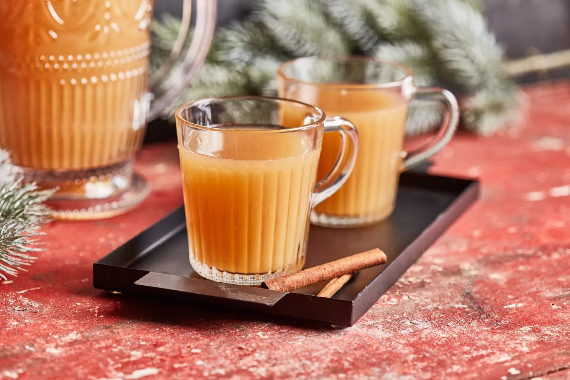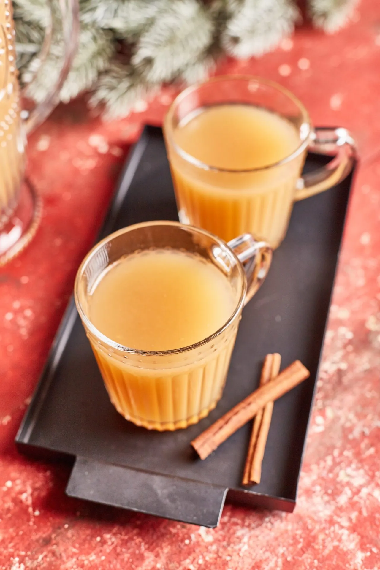 Az almákat, körtéket és a narancsokat alaposan megmossuk, majd negyedekre vágjuk, és egy nagy lábasba rakjuk őket. Beledobjuk a fűszereket, felöntjük a körte- és almalével, valamint a vízzel, és kb. 3 órát főzzük, közepes lángon.