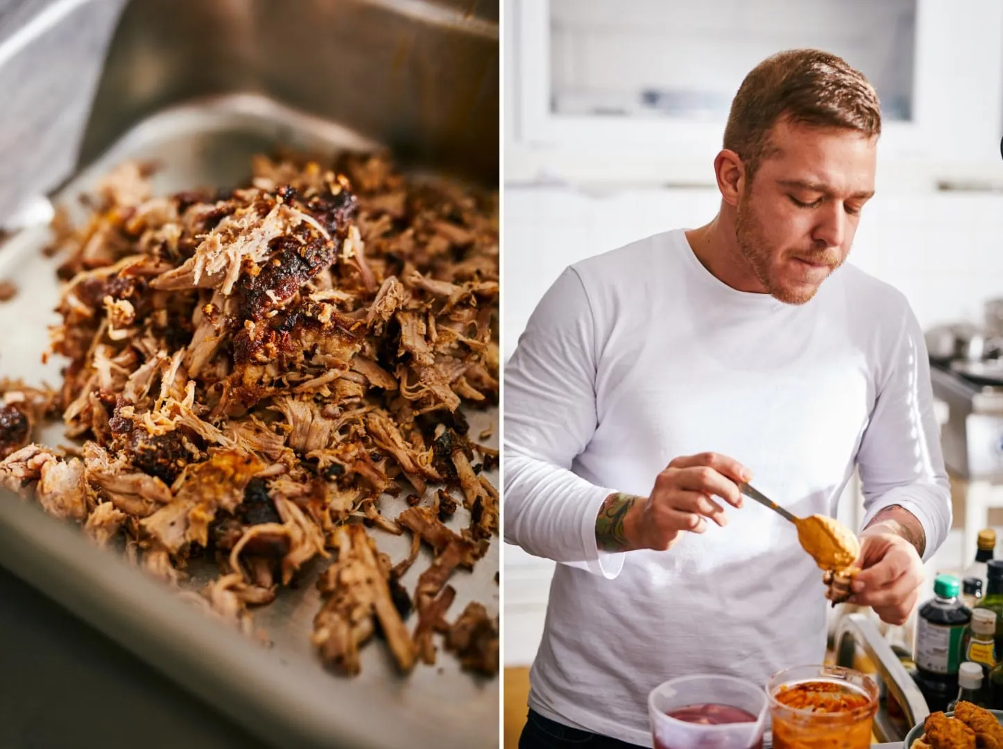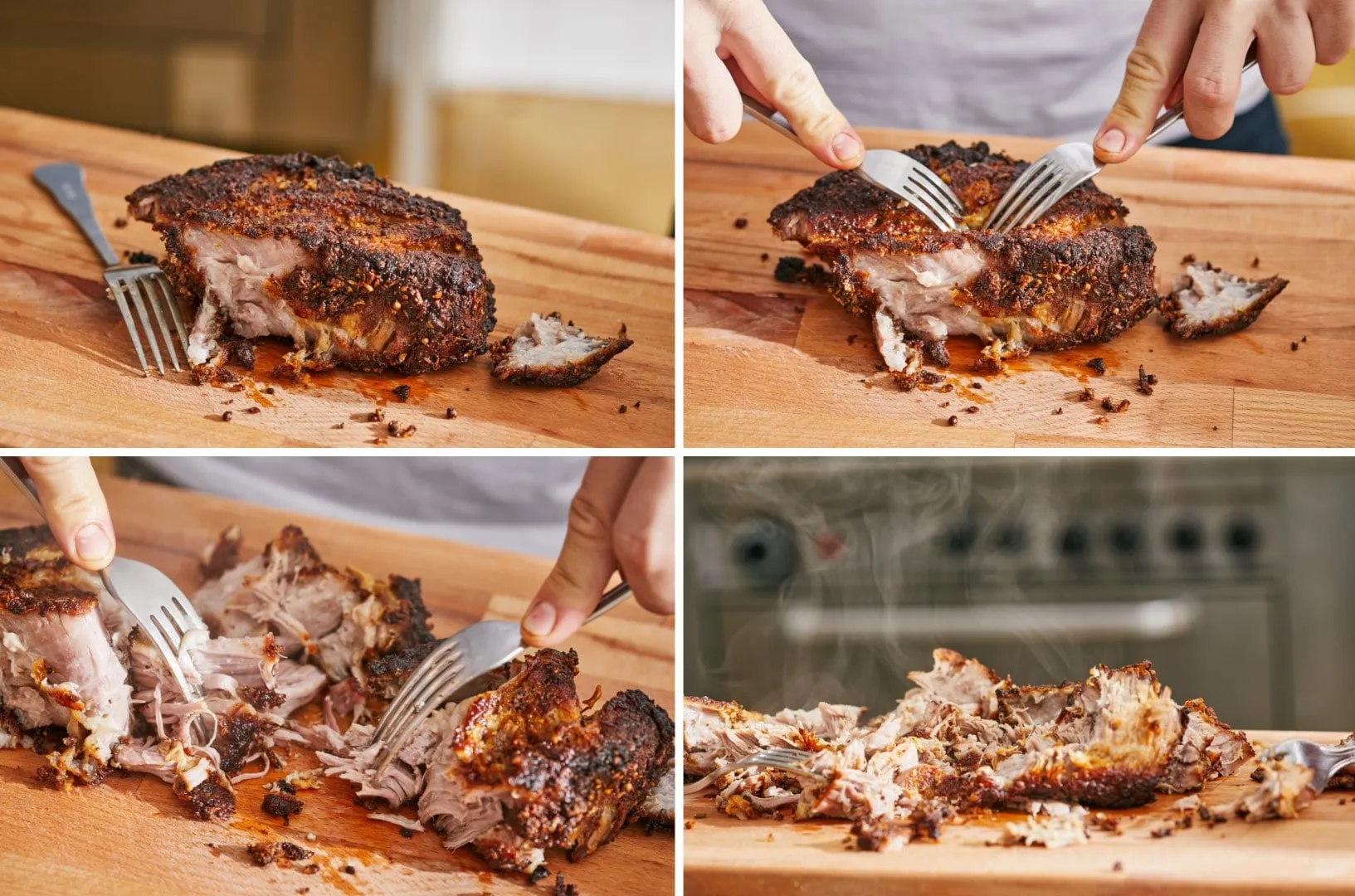 A tépett disznóhoz a fűszereket egy aprítógépben összedolgozzuk, majd megkenjük a húst a mustárral, és teljesen elfedjük a fűszermixünkkel. 150 fokra előmelegített sütőben kb. 5 órán át sütjük, amíg annyira megpuhult, hogy egy villával szét tudjuk tépkedni.
