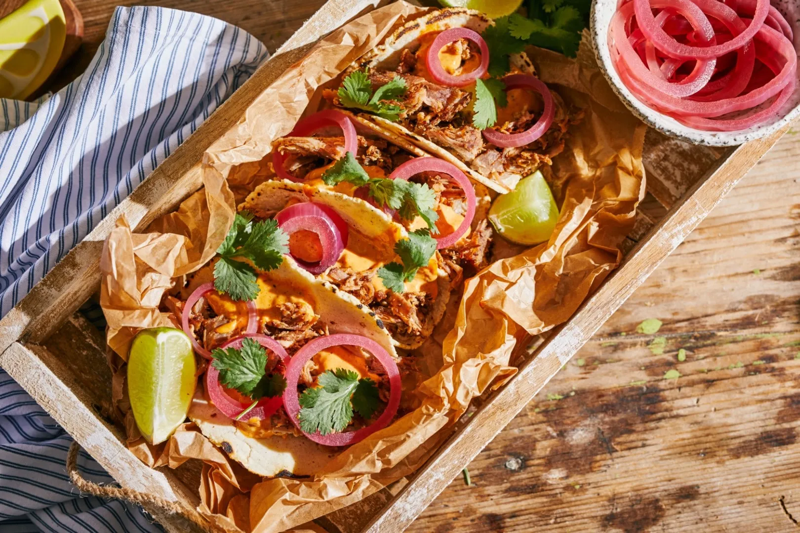 Tálaláskor a tortillába szedünk egy kevés tépett húst, megcsorgatjuk a majonézzel, teszünk rá a savanyított hagymából, tépünk egy kis koriandert a tetejére, és facsarunk rá a lime-ból.