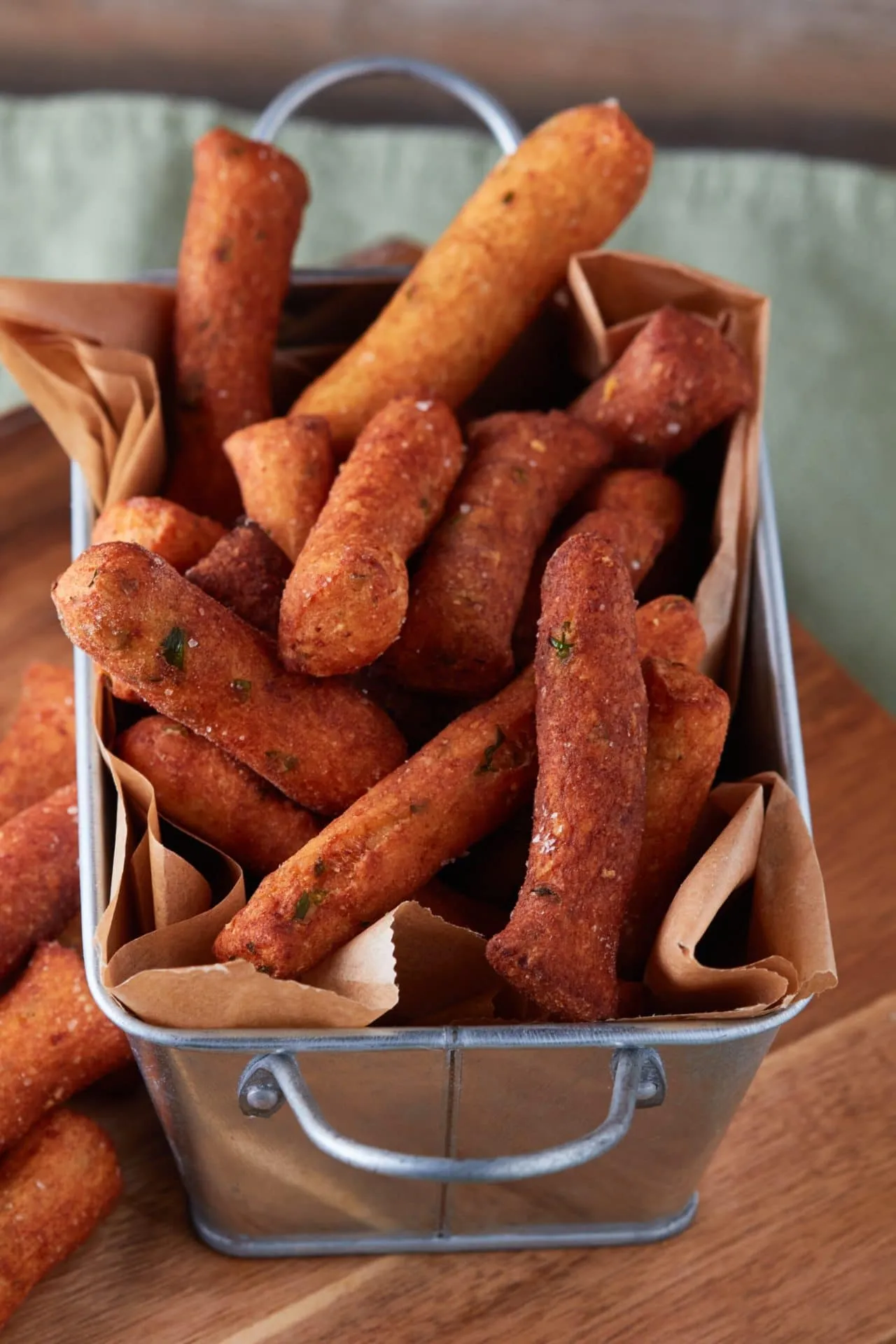 A főtt burgonyát átpasszírozzuk, majd hozzáadjuk a lisztet, a tojást, a parmezánt, a sót, a borsot, az aprított petrezselymet, és összedolgozzuk. Vigyázzunk, ne gyúrjuk nagyon sokáig, mert akkor nem lesz laza a tésztánk. Ha ezzel megvagyunk, egy enyhén lisztezett deszkán a kezünkkel hengert sodrunk a tésztából, majd 6-10 cm-es darabokat vágunk belőle. Forró olajban aranybarnára sütjük, majd törlőpapírra szedjük, és leitatjuk.
