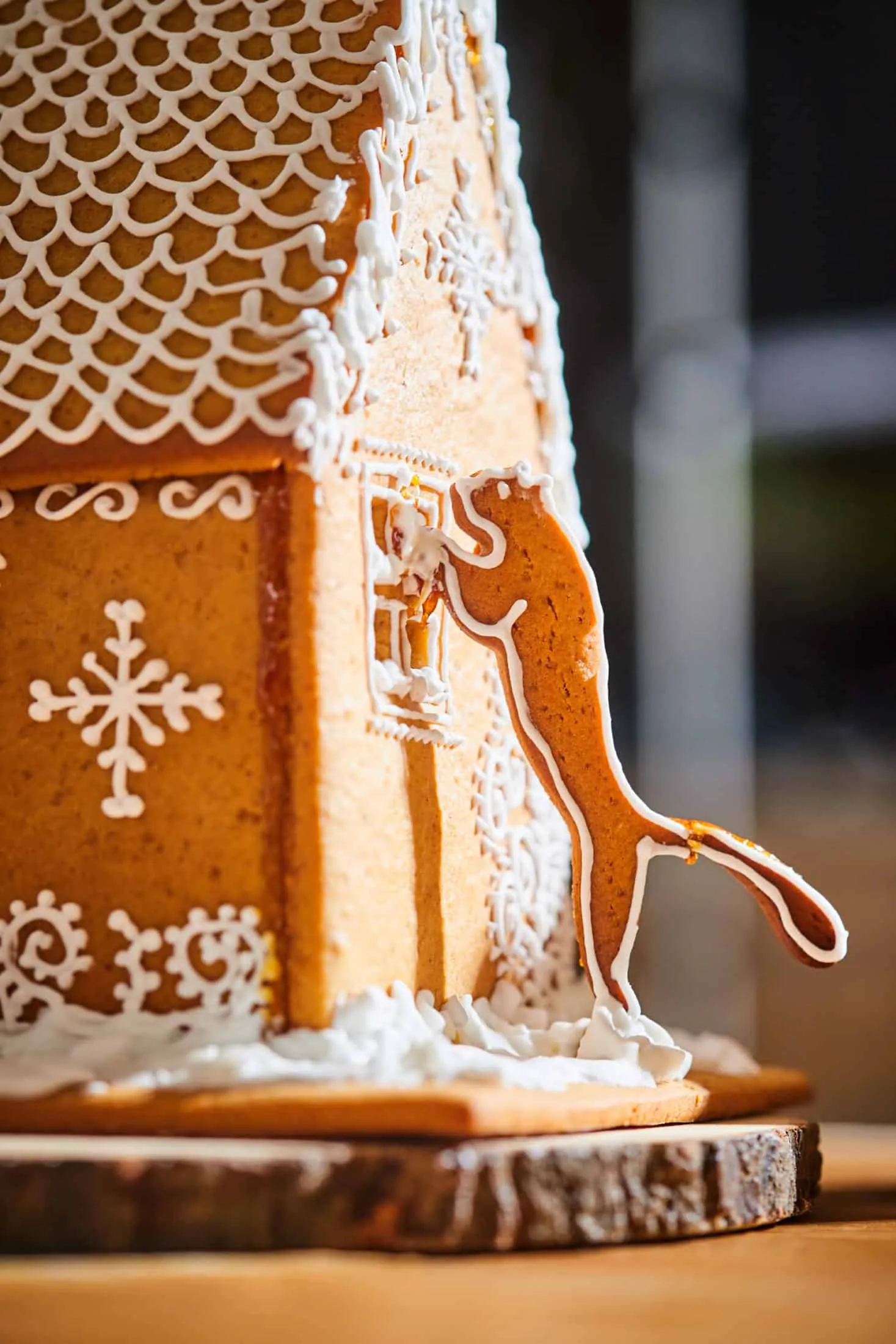 Mikor megszáradt a cukormáz, egy serpenyőben kristálycukrot karamellizálunk, és ezzel tapasztjuk össze a házfalakat. Ezzel óvatosan dolgozzunk, mert egyrészt villámgyorsan szárad a karamell, másrészt könnyen égési sérüléseket okozhatunk magunknak. Az első 2-3 házfal széleit mártsuk bele a cukorba, és egyből illesszük őket össze, hogy összetapadjanak, majd egy hurkapálca segítségével, töltsük ki a kimaradt részeket. A háztető széleire gyorsan kerüljön egy kanálnyi cukormáz, és azonnal mehetnek is rá a házra. Pár pillanat alatt megszárad a karamell, és már kész is vagyunk a saját kis mézeskalács házunkkal.