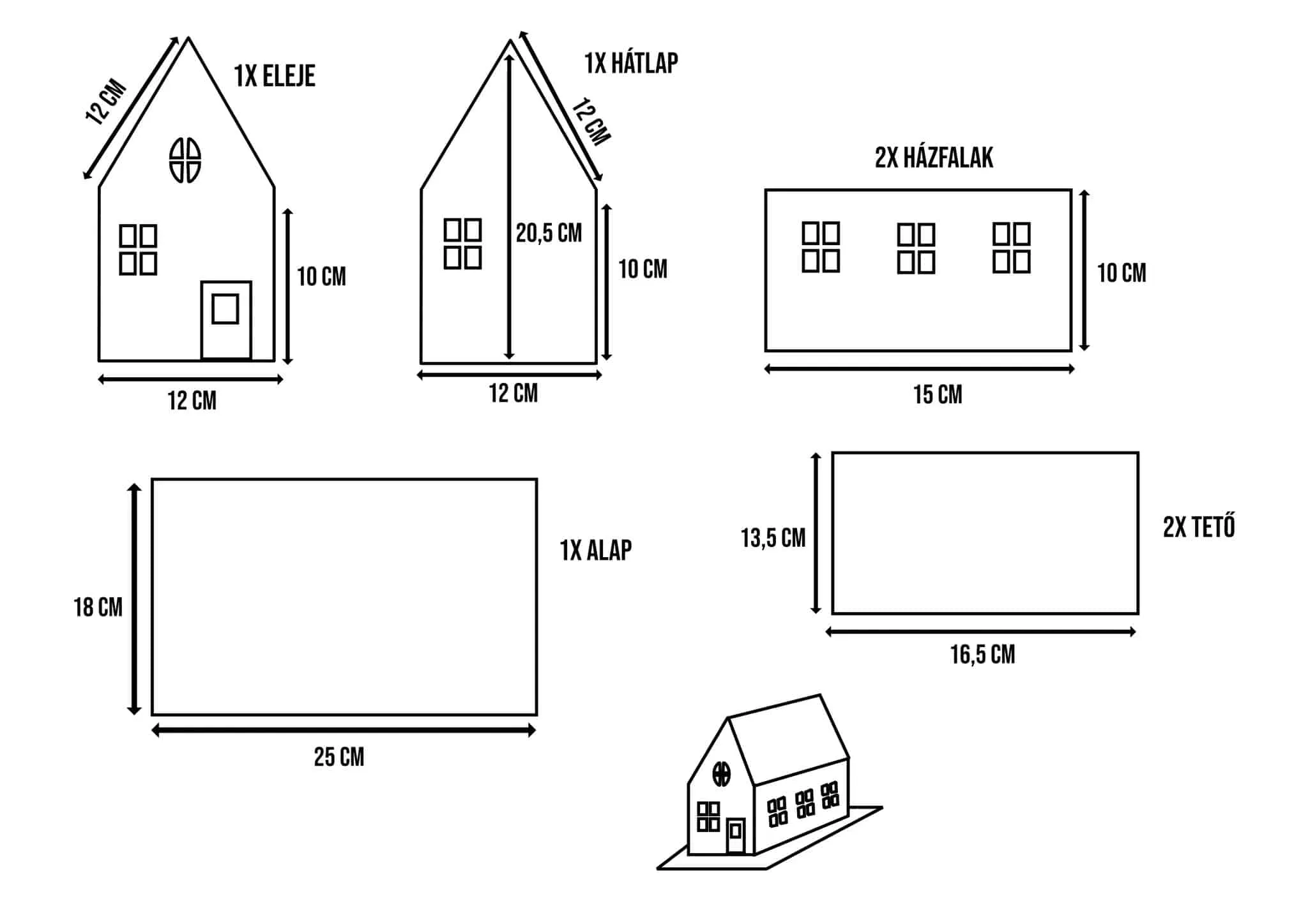 A hűtőből kivéve hagyjuk egy kicsit felengedni a masszát, 2 részre osztjuk, hogy könnyebb legyen vele dolgozni, és lisztezett deszkán 3-4 mm vastagságúra nyújtjuk. Kivágjuk belőle a sablonnak megfelelő méreteket, és tetszőlegesen kis ablakokat, ajtókat a házfalakra. Ha szeretnénk, készíthetünk kéményt is, a leeső és megmaradt darabokat pedig újra összegyúrhatjuk, és szaggathatunk belőle különböző formákat, de akár fóliába csomagolva el is rakhatjuk a tésztát. Hűtőben 1-1,5 hétig, fagyasztóban fél évig is simán eláll.