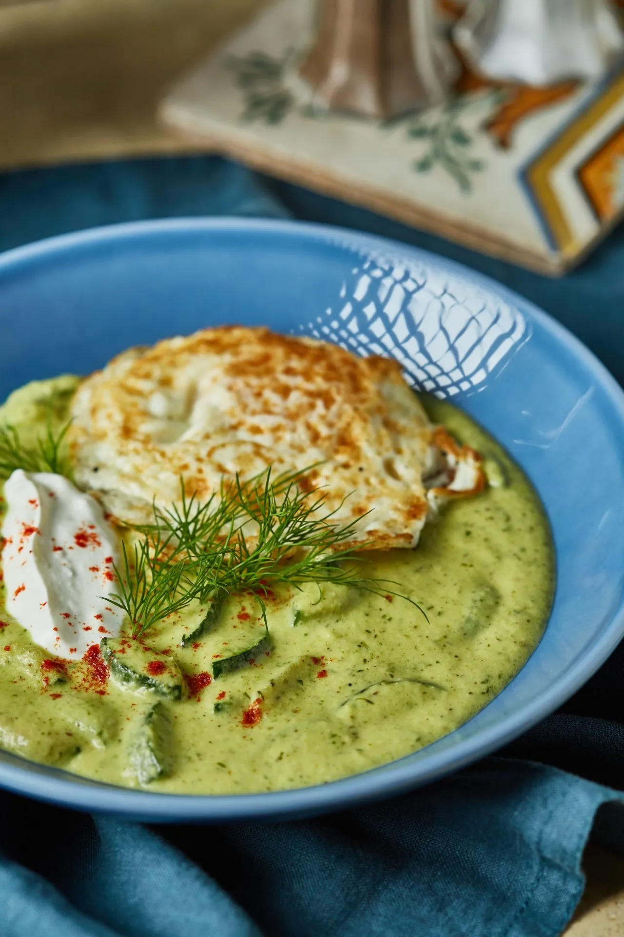 A tojásokat egy forró serpenyőbe ütjük 1-1 evőkanál olajra, és oldalanként 2-3 perc alatt ropogósra sütjük őket. A cukkinifőzeléket a fordított tükörtojással tálaljuk.