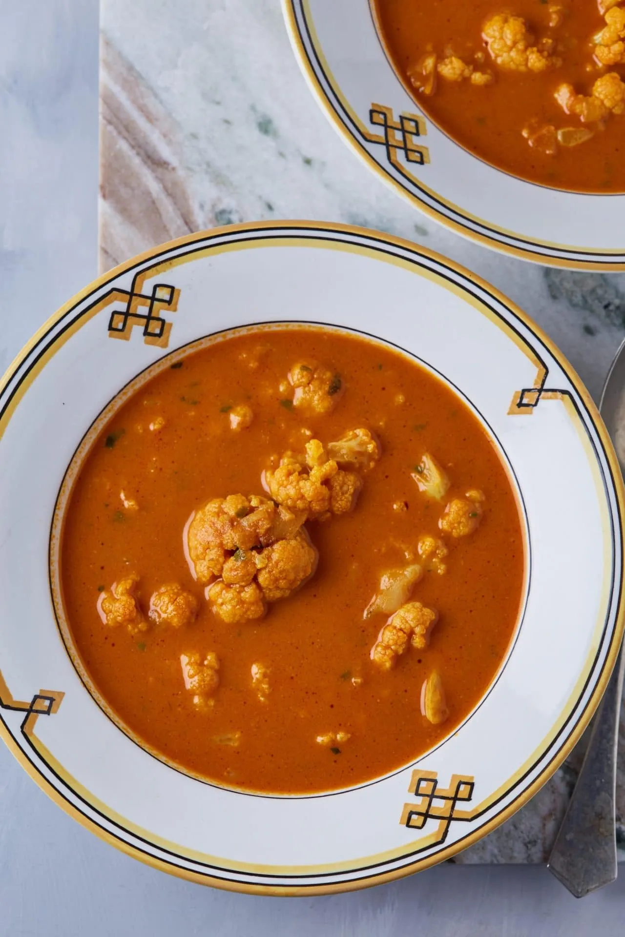 Az olajon először lepirítjuk az apróra vágott hagymát, fokhagymát és a megtisztított, szintén apróra vágott gyömbért. Ezután mehetnek rá a fűszerek, amiket egy picit szintén lepirítunk, majd rárakjuk az átmosott, kisebb rózsáira bontott karfiolt. Felöntjük az alaplével és a passatával, és puhára főzzük a karfiolt. A főzés vége felé mehet bele a kókusztej, megvárjuk, amíg újra felforr a leves, és már készen is vagyunk.