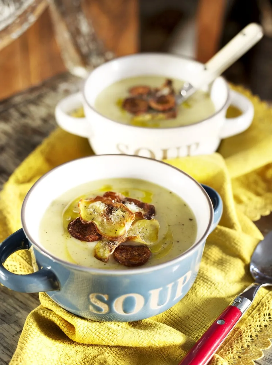 Vannak azok a kaják, amiket bármikor eszel, megmelengetik a szívedet. Na, mi például így vagyunk a burgonyakrémlevessel, ami egyszerűen rögtön képes feldobni a kedvünket még a legzordabb időjárás esetén is. Ez most ráadásul egy nagyon ütős recept változat, burgonya-és kolbászchipsszel felturbózva!
