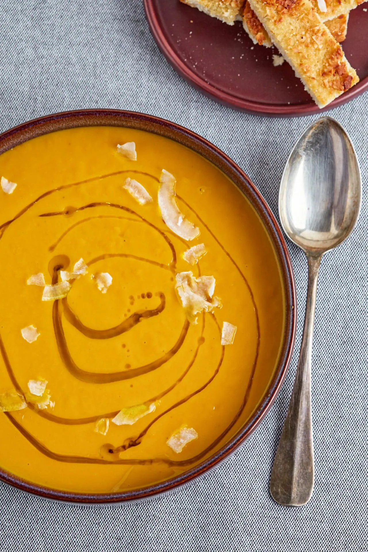 Az édesburgonyát meghámozzuk, feldaraboljuk, majd a fahéjjal, a fokhagymával és a chipotléval átpirítjuk az olívaolajon, majd felöntjük az alaplével, sózzuk, borsozzuk, és puhulásig főzzük. Amikor puhára főtt az édesburgonya, kivesszük a fahéjat, hozzáöntjük a fehérborecetet, leturmixoljuk, majd egy sűrű szövésű szűrőn átpasszírozzuk.
