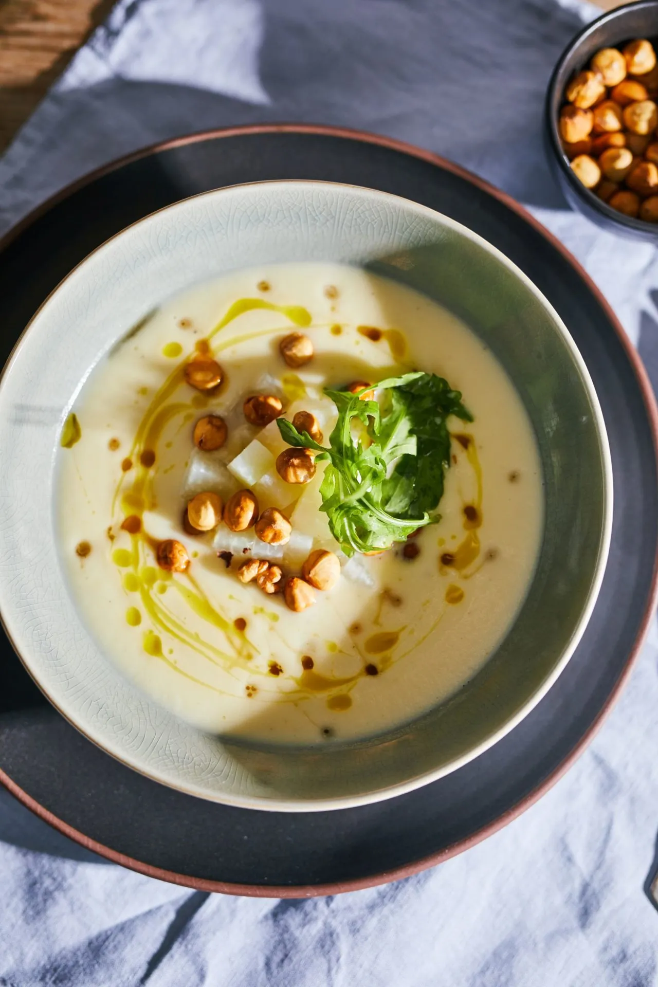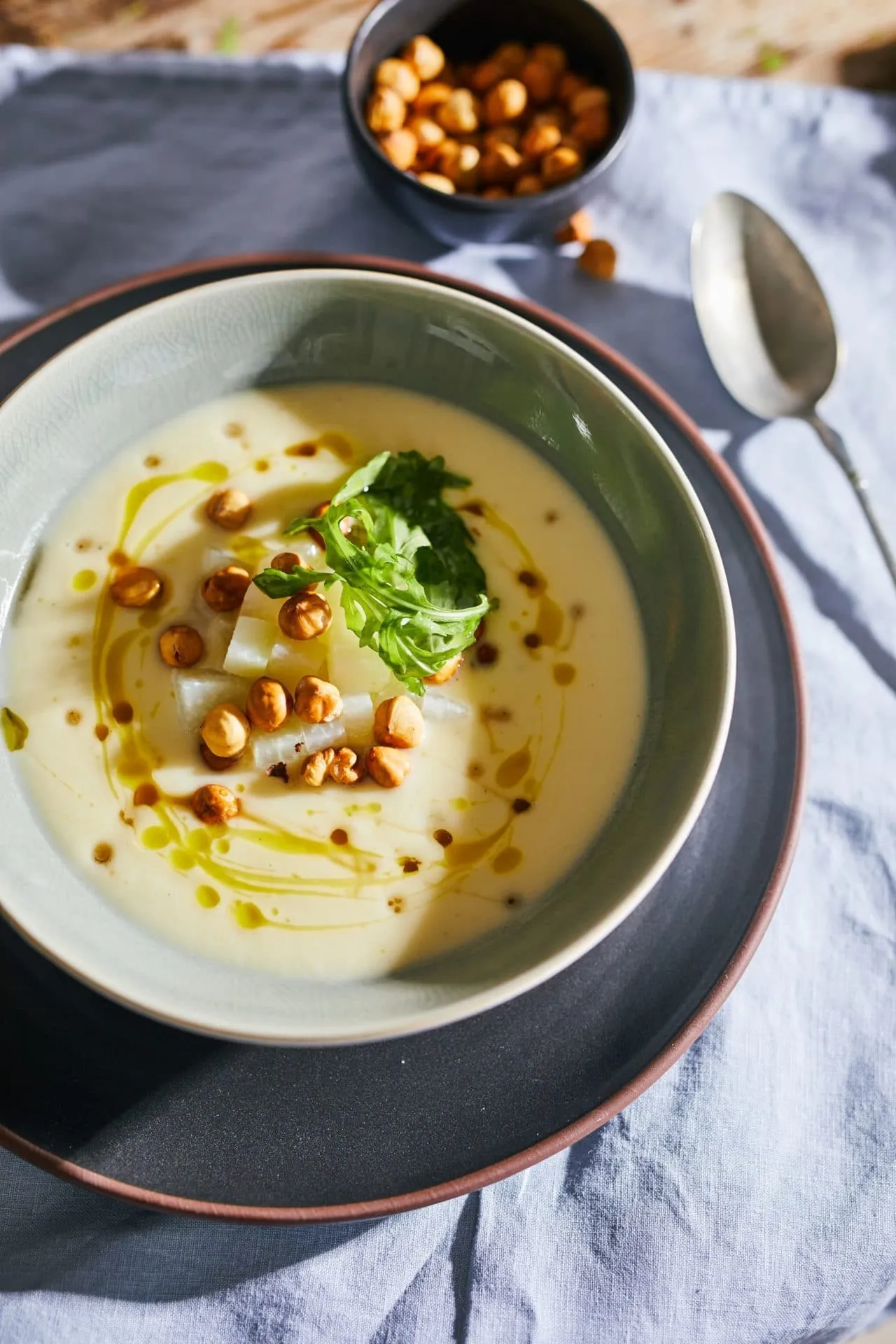 A levest a karalábékockákkal és a mogyoróval tálaljuk, majd megcsorgatjuk egy kevés juharsziruppal és szarvasgombaolajjal.