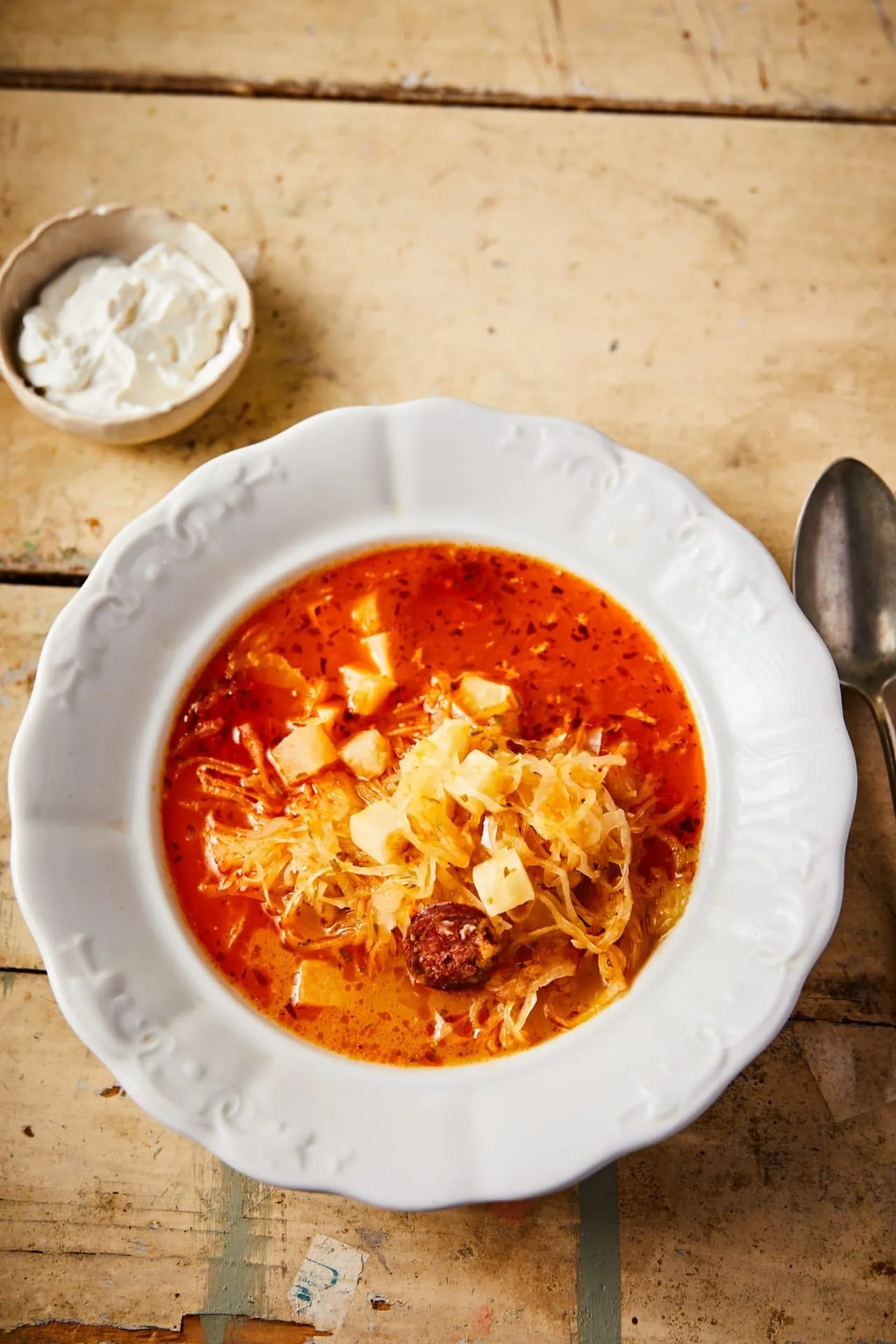 A savanyúkáposzta leves elkészítéséhez az aprított hagymát és fokhagymát 3-4 evőkanál olajon lepirítjuk, majd hozzáadjuk a lisztet, és még 2-3 percig pirítjuk. Rátesszük a fűszerköményt, felöntjük 500 ml alaplével, és egy botmixer segítségével turmixoljuk. Hozzáadjuk a maradék alaplevet, a savanyú káposztát (ha túl savanyúnak találjuk, előtte át is moshatjuk), a tárkonyt, a babérlevelet, a felkarikázott kolbászt, és felforraljuk.