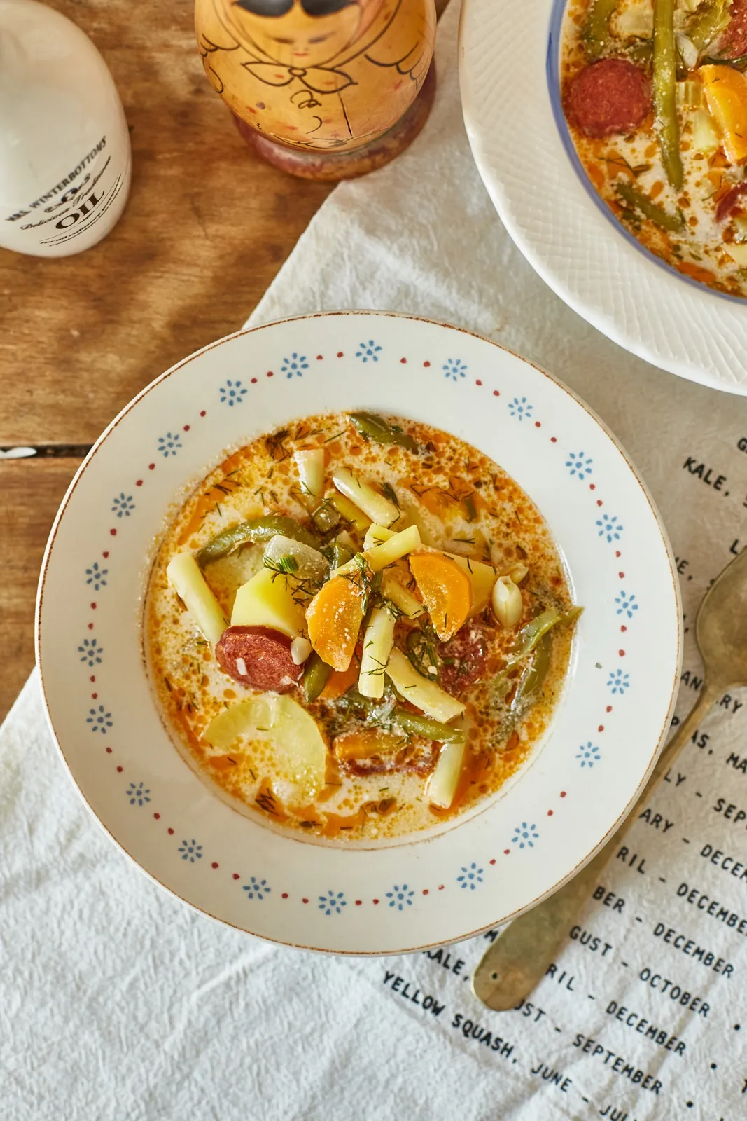 A babokat kivesszük a fagyasztóból és hagyjuk kiolvadni. Egy nagy lábasban egy kevés olajon a felkarikázott kolbászt zsírjára pirítjuk. Rádobjuk az apróra vágott hagymát, fokhagymát és 1-2 percig pirítjuk. Mehet bele az apróra vágott zeller és a felkarikázott répa. Jól összekeverjük, sózzuk, borsozzuk, majd lefedjük, és további 3-4 percig pároljuk. Beledobjuk a felkockázott krumplit, a két fajta babot, és felöntjük a vízzel. Felforraljuk és lassú tűzön kb. fél óra alatt puhára főzzük benne a zöldségeket.