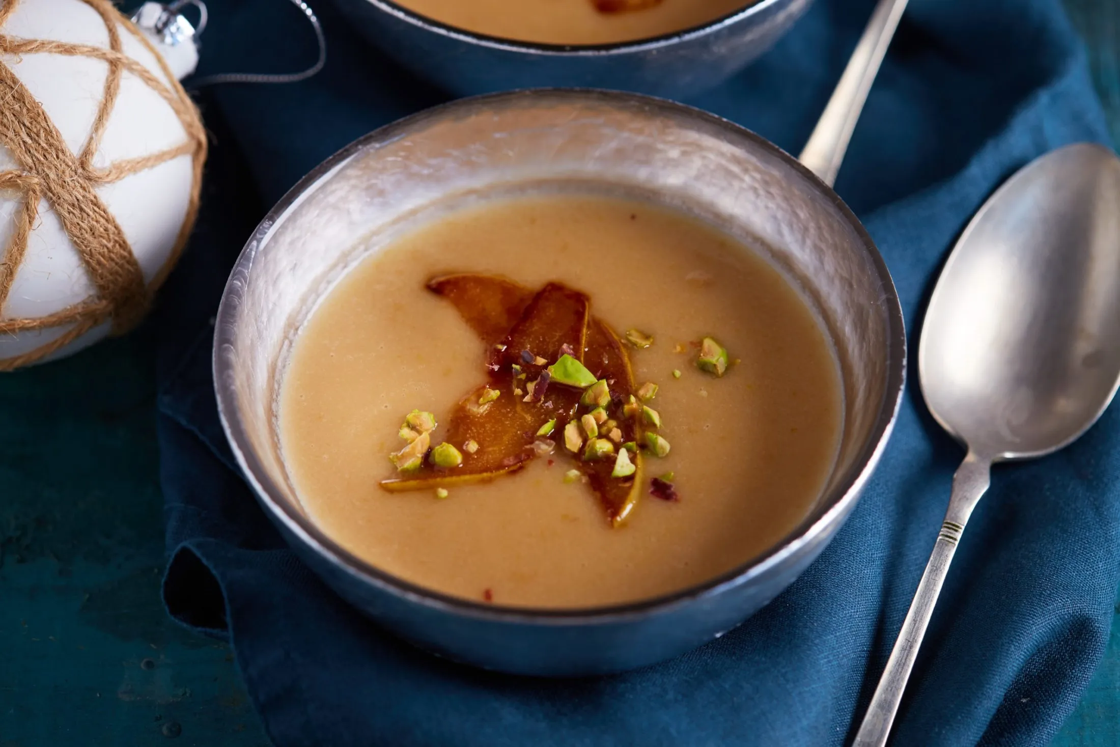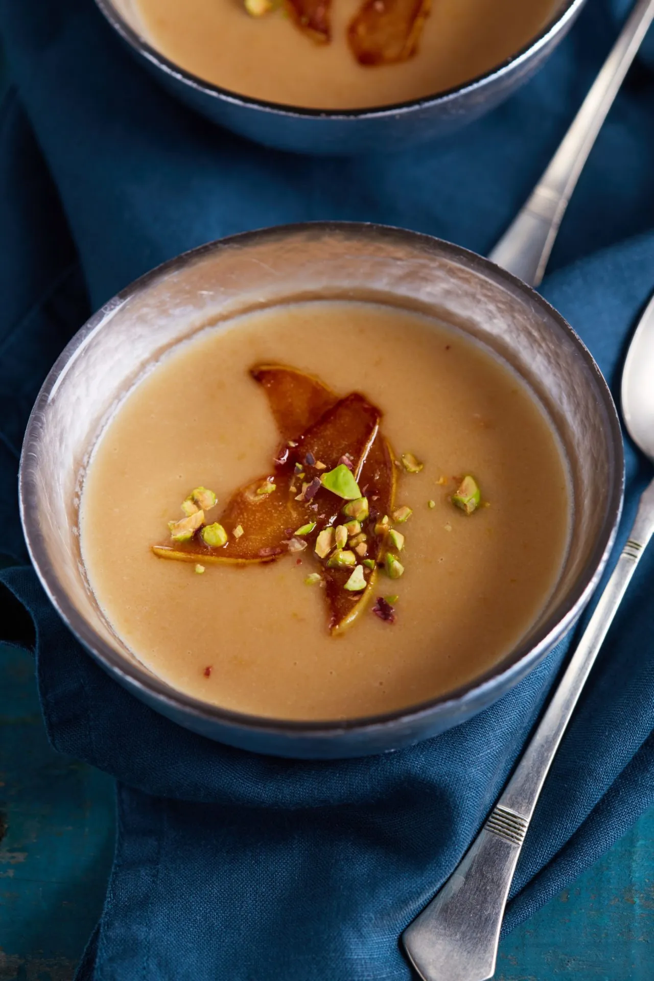 Egy serpenyőben felolvasztjuk a vajat a cukorral, és megpirítjuk benne a félretett körteszeleteket. A levest tányérokba szedjük, a pirított körteszeletekkel és a pisztáciával megszórva hidegen ajánljuk, de borús napokon melegen is jól fog esni.