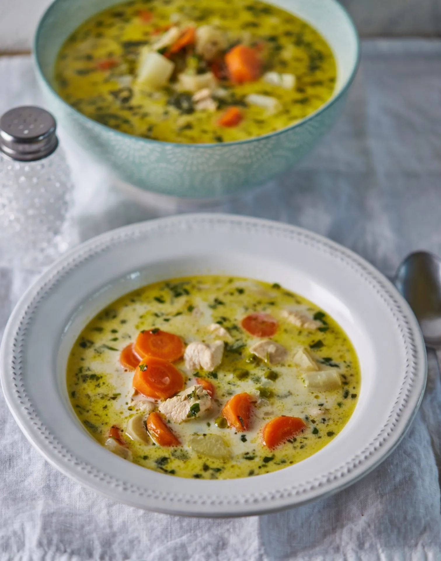 Ezután hozzáadjuk a zöldborsót, majd ha az is megfőtt, beleöntjük a tejszínt. Ha újra felforrt a leves, ízlés szerint facsarunk bele egy kevés citromlevet, és ezzel el is készült a tárkonyos raguleves.