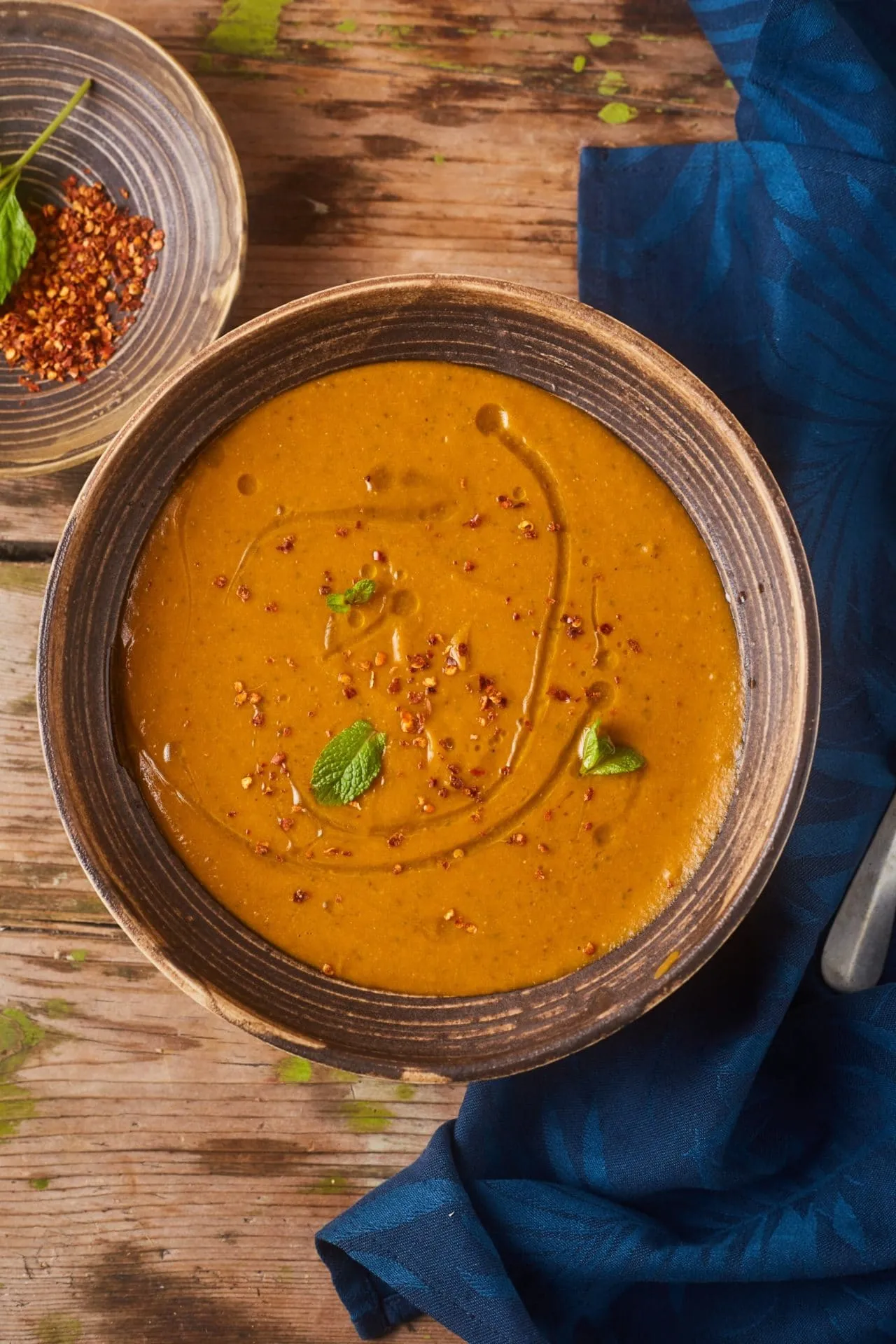 Belerakjuk a mentát, az egészet leturmixoljuk, pár csepp citromlével ízesítjük, és visszarakjuk egyet forrni. Chilipehellyel és friss mentával díszítjük.