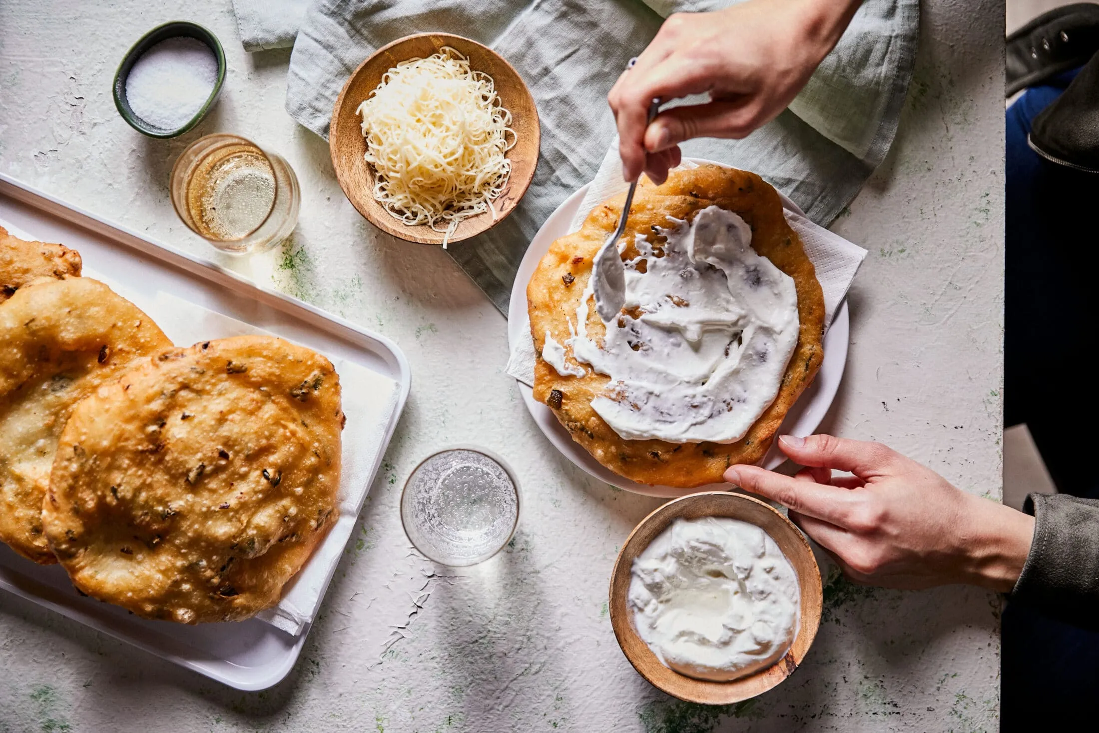 Édesburgonyás-zöldfűszeres lángos, tejföllel és camembert-rel