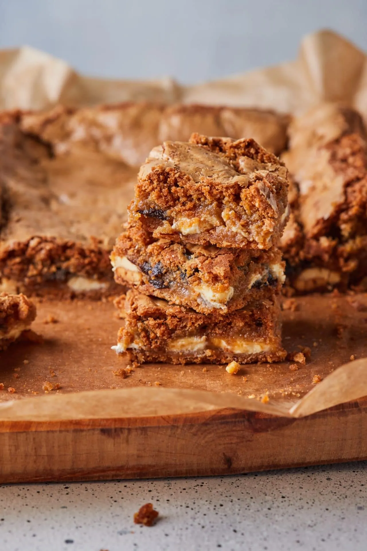 A fehér csokit apró darabokra tördeljük, az aszalt szilvát áfonya nagyságúra daraboljuk, majd mindkettőt a tésztába keverjük. Egy sütőpapírral bélelt kb. 23 cm-es, téglalap alakú tepsibe tesszük a masszát, laposra egyengetjük majd, 180 fokra előmelegített sütőben kb. 35-40 percig sütjük. Amikor kész, 10-15 percig hagyjuk hűlni, majd felvághatjuk. Egy fedett dobozban tároljuk.