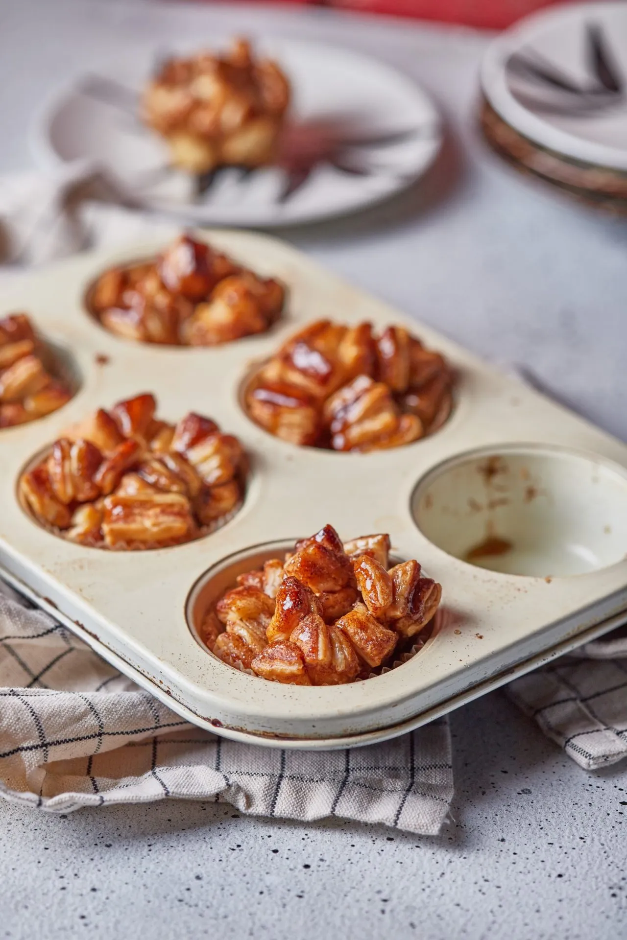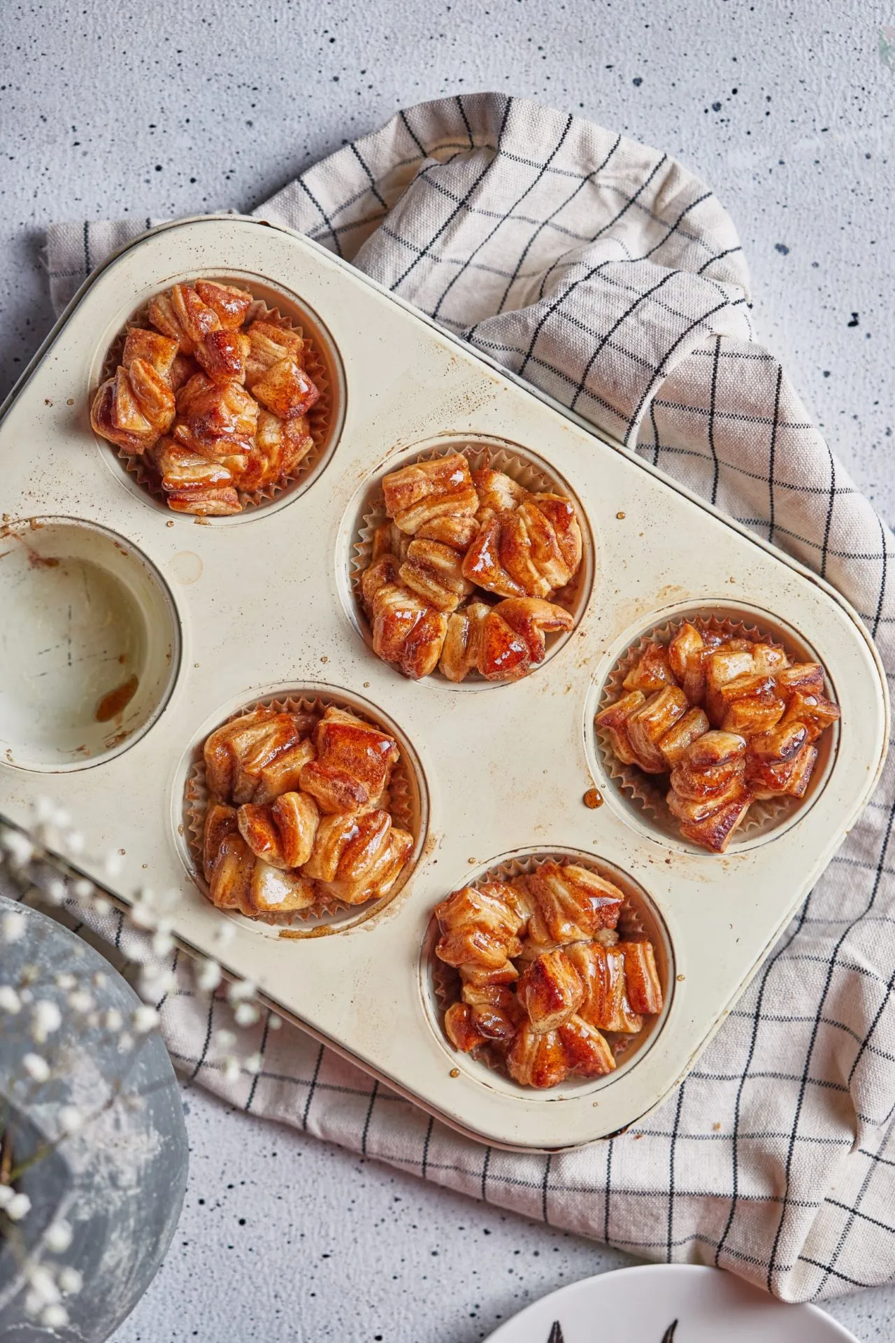 Az egyik leveles tésztát kicsomagoljuk és kitekerjük. A vajat megolvasztjuk, összekeverjük a barna cukorral és a kétféle fűszerrel, majd megkenjük vele a leveles tésztát. Erre rányomogatjuk a másik, kicsomagolt tésztalapot, félbevágjuk, és egymásra rakjuk a két fél darabot. Kb. 1,5-2 cm-es négyzeteket vágunk belőle, és muffinkapszlikkal bélelt muffinsütő formába pakolunk pár darab kis „kockát”. Nem szükséges szabályosan rakni, és nyomogatni sem kell őket. 180 fokra előmelegített sütőbe toljuk és aranybarnára sütjük őket, majd rácson hagyjuk kihűlni.