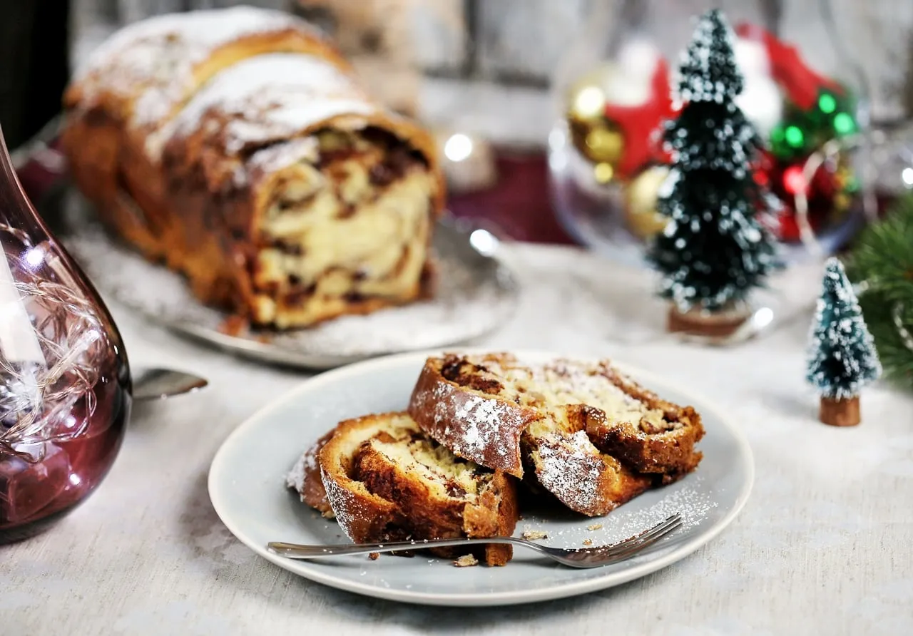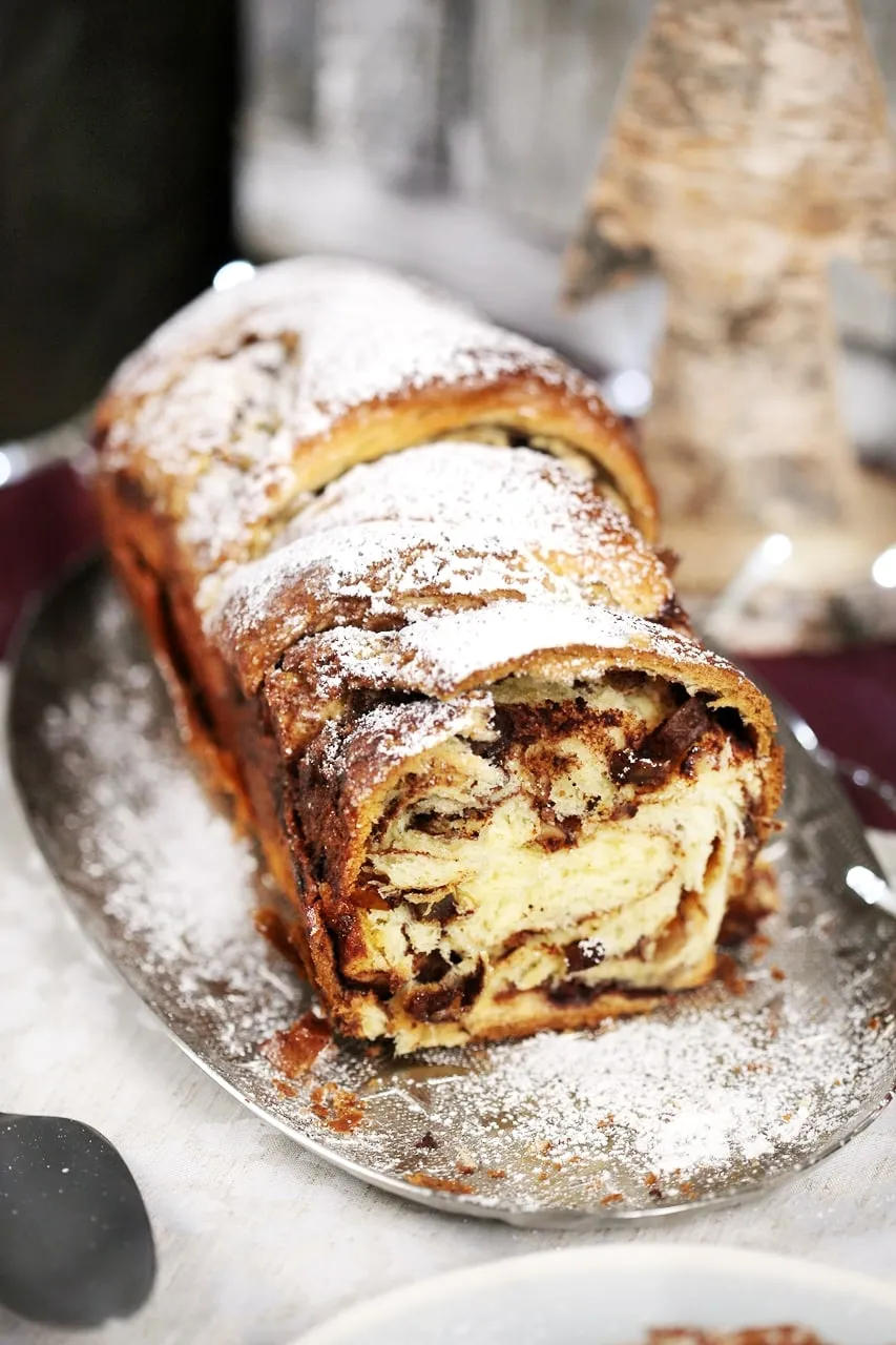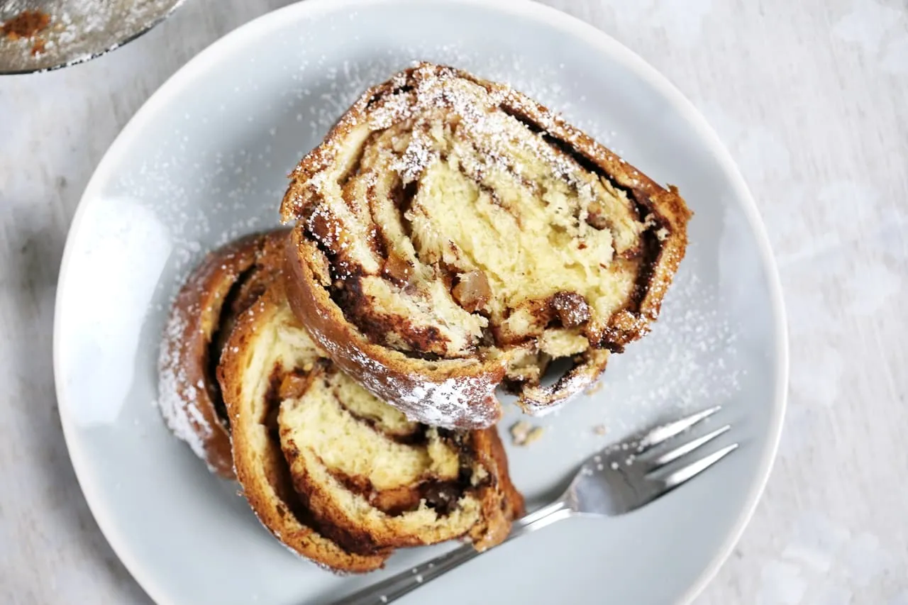 Mikor megkelt, lisztezett deszkán kinyújtjuk a tésztát, megkenjük az olvasztott vaj ⅔-ával, megszórjuk a cukorral, fahéjjal és kandírozott naranccsal és végül meglocsoljuk a maradék vajjal. Feltekerjük a tésztát, megcsavarjuk és belerakjuk a formába, majd letakarva kelni hagyjuk 30 percig. Mikor megkelt, lekenjük enyhén felvert tojás és tej keverékével és 175 fokos sütőben kb. 40-45 perc alatt készre sütjük. (Ha túl lágynak tűnik, de már barnul a teteje, letakarjuk alufóliával, hogy nehogy megégjen.)