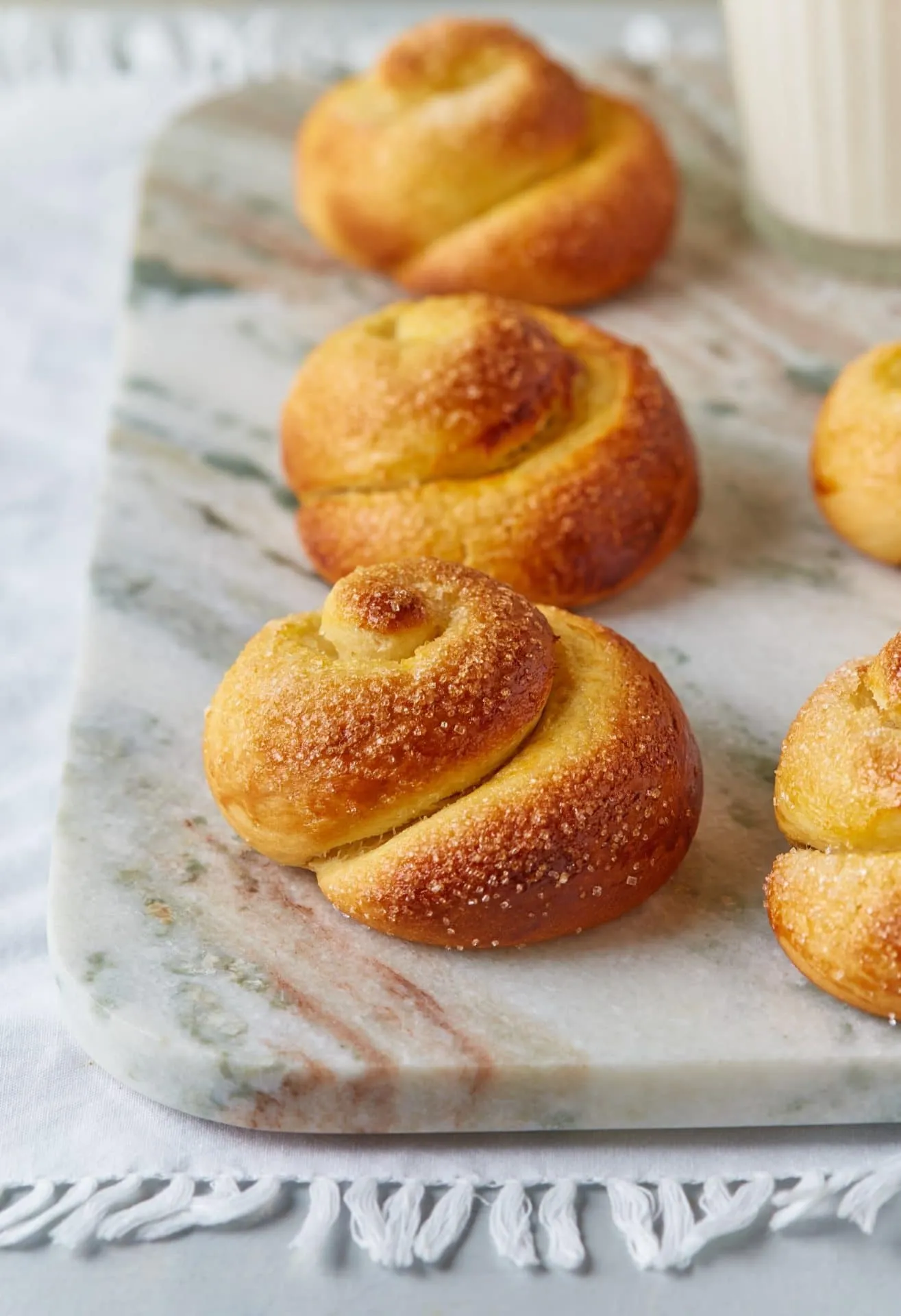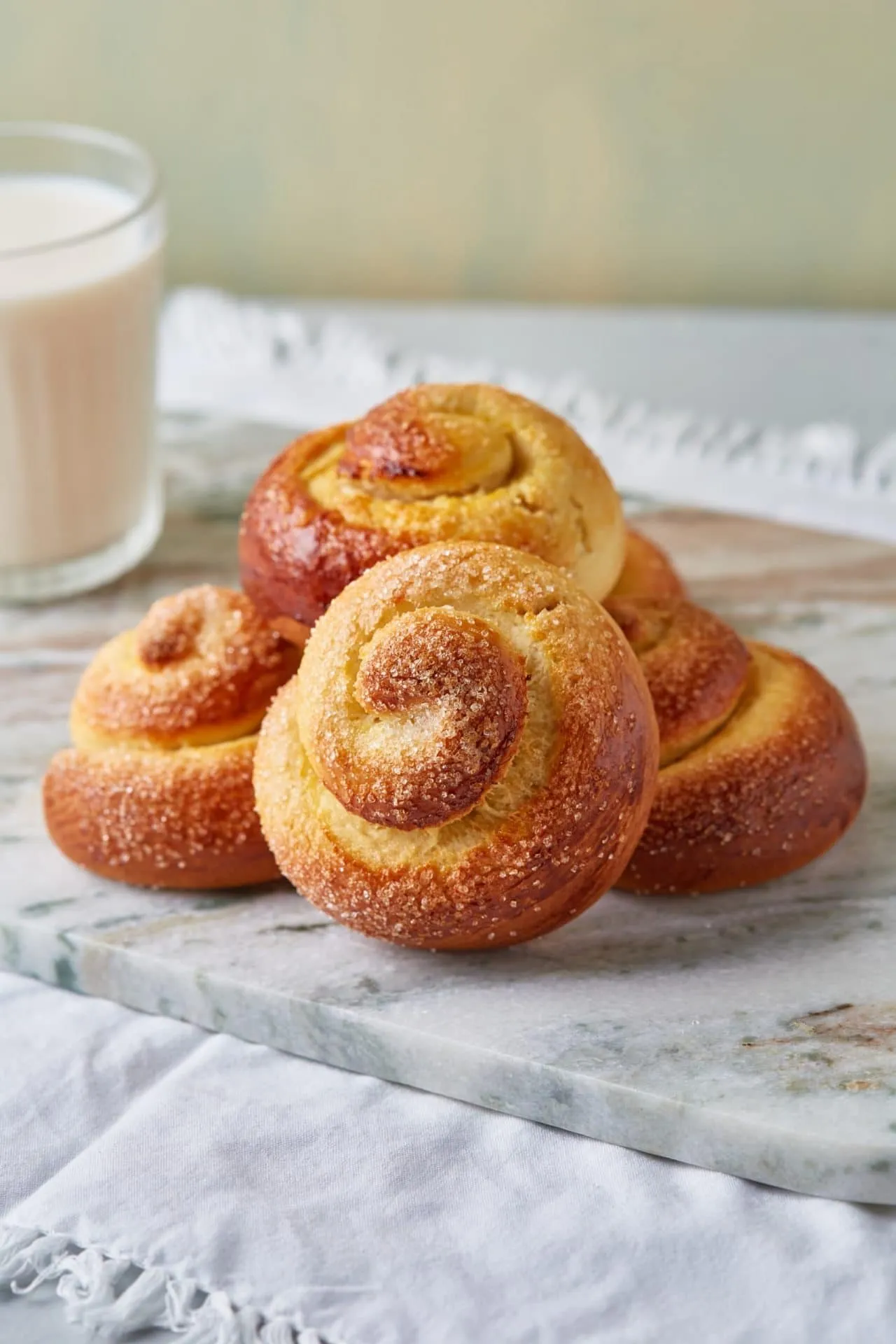 6 felé osztjuk, és mindegyik gombócot kb. 26 cm-es rúddá sodorjuk. Feltekerjük őket, a végeiket bedugjuk a brióscsomók alá, és 20-25 percig megint kelesztjük őket. Mikor kissé megkeltek a briósok, lekenjük őket lazán felvert tojással, megszórjuk a cukorral, és 175 fokra előmelegített sütőben aranybarnára sütjük őket (kb. 25-30 perc).