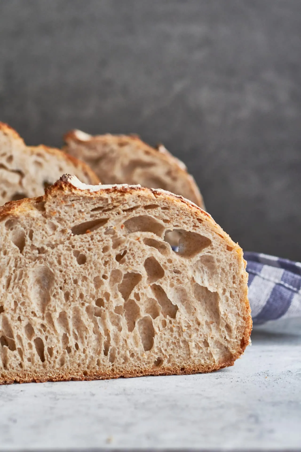 Másnap reggel, ha letelt az idő, kivesszük a kenyeret a hűtőből, előmelegítjük a sütőt 250 fokra, és berakunk tetővel együtt egy vaslábast vagy egy jénai tálat. Mikor felforrósodott a sütő, a kenyeret egy szilikonos sütőpapírdarabra borítjuk, és bemetsszük a tetejét egy nagyon éles késsel, sniccerrel vagy borotvapengével. Kivesszük a vaslábast a sütőből, levesszük a tetejét, beleemeljük a kenyeret a sütőpapírral együtt, rárakjuk a fedőt, és berakjuk 30 percre a sütőbe. 30 perc után levesszük a fedőt, visszavesszük a hőmérsékletet 230 fokra, és így sütjük további 15-20 percig a kenyeret, amíg szépen megpirul a teteje is. Rácson hagyjuk kihűlni, és csak ezután szeleteljük.