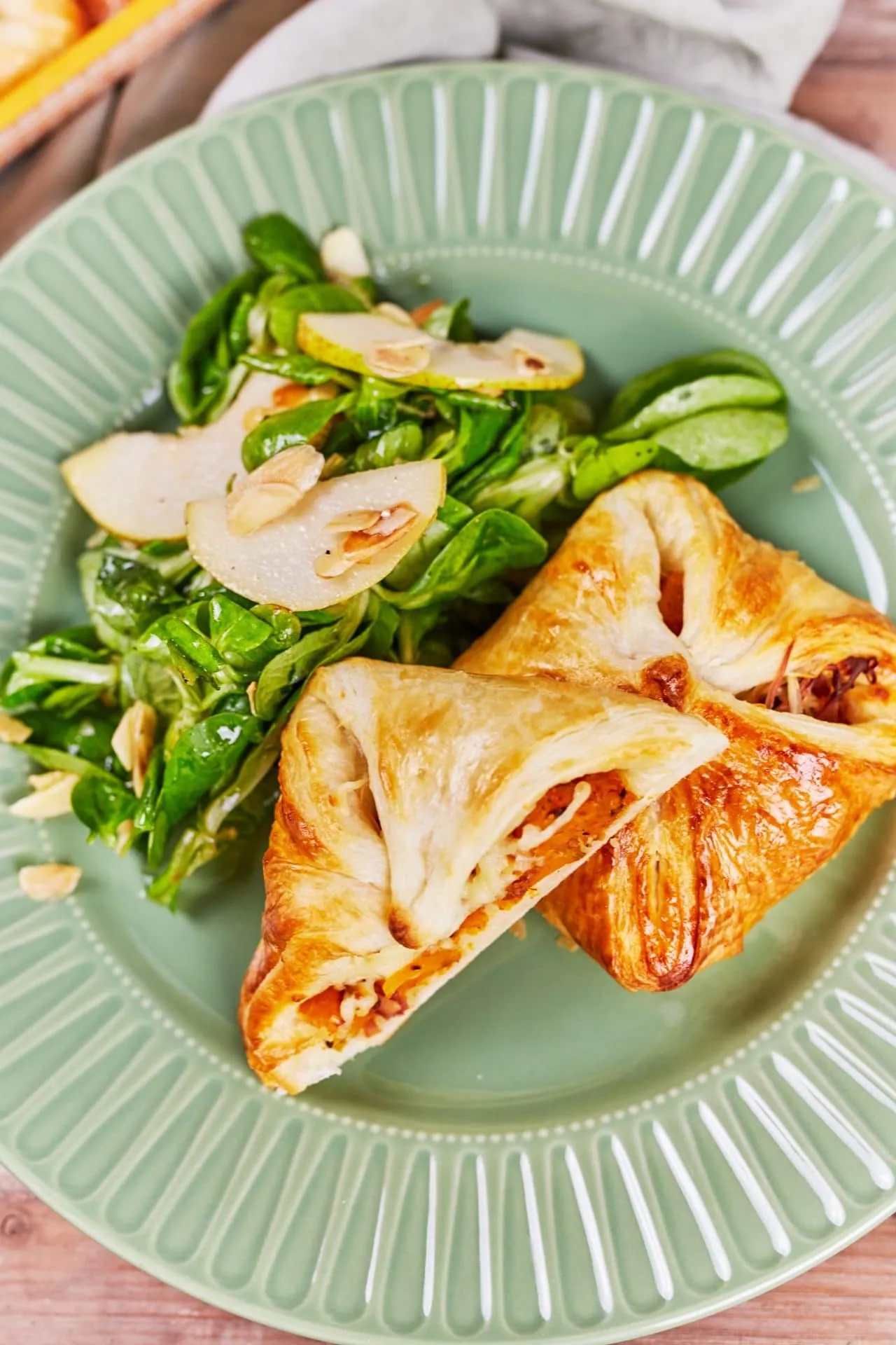 Közben a salátához a körte magházát eltávolítjuk, meglocsoljuk egy kis citromlével, vékonyan felszeleteljük, és összekeverjük a többi hozzávalóval. A dresszing hozzávalóit egy kis üvegben összerázzuk, és ráöntjük a salátára. A batyukat ezzel tálaljuk.