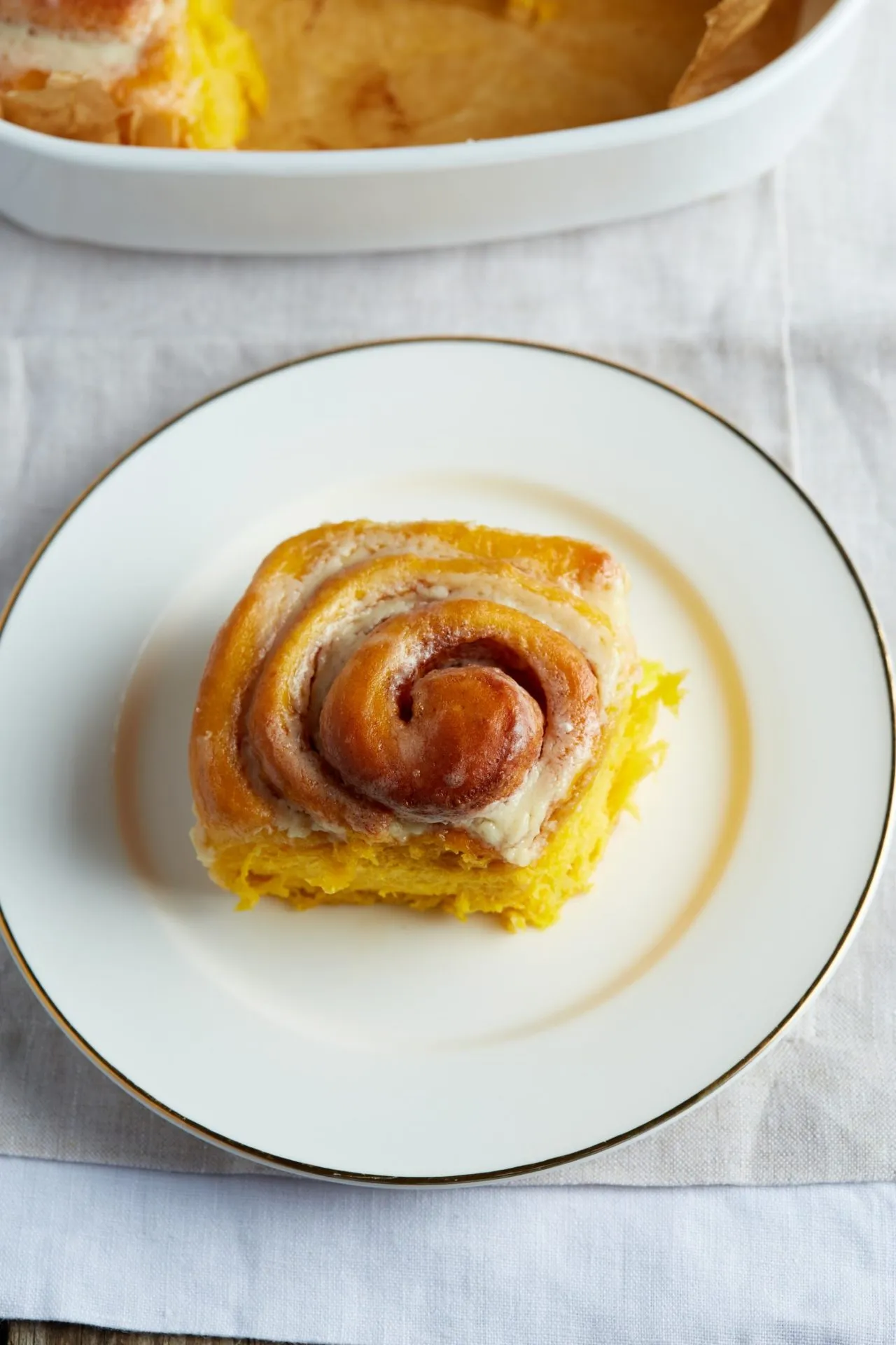 A töltelékhez lekenjük a tészta felületét 90 g olvasztott vajjal. A barna cukrot kikeverjük a fűszerekkel és megszórjuk vele a vajazott tésztát. Feltekerjük, és 2 ujjnyi vastag csigákat vágunk belőle, amiket egy sütőpapírral bélelt tepsire rakunk. Hézagosan, egymás mellé tesszük a csigákat, lefedjük, és további fél órát hagyjuk kelni. Ezután 180 fokra előmelegített sütőben 25-30 perc alatt megsütjük őket.