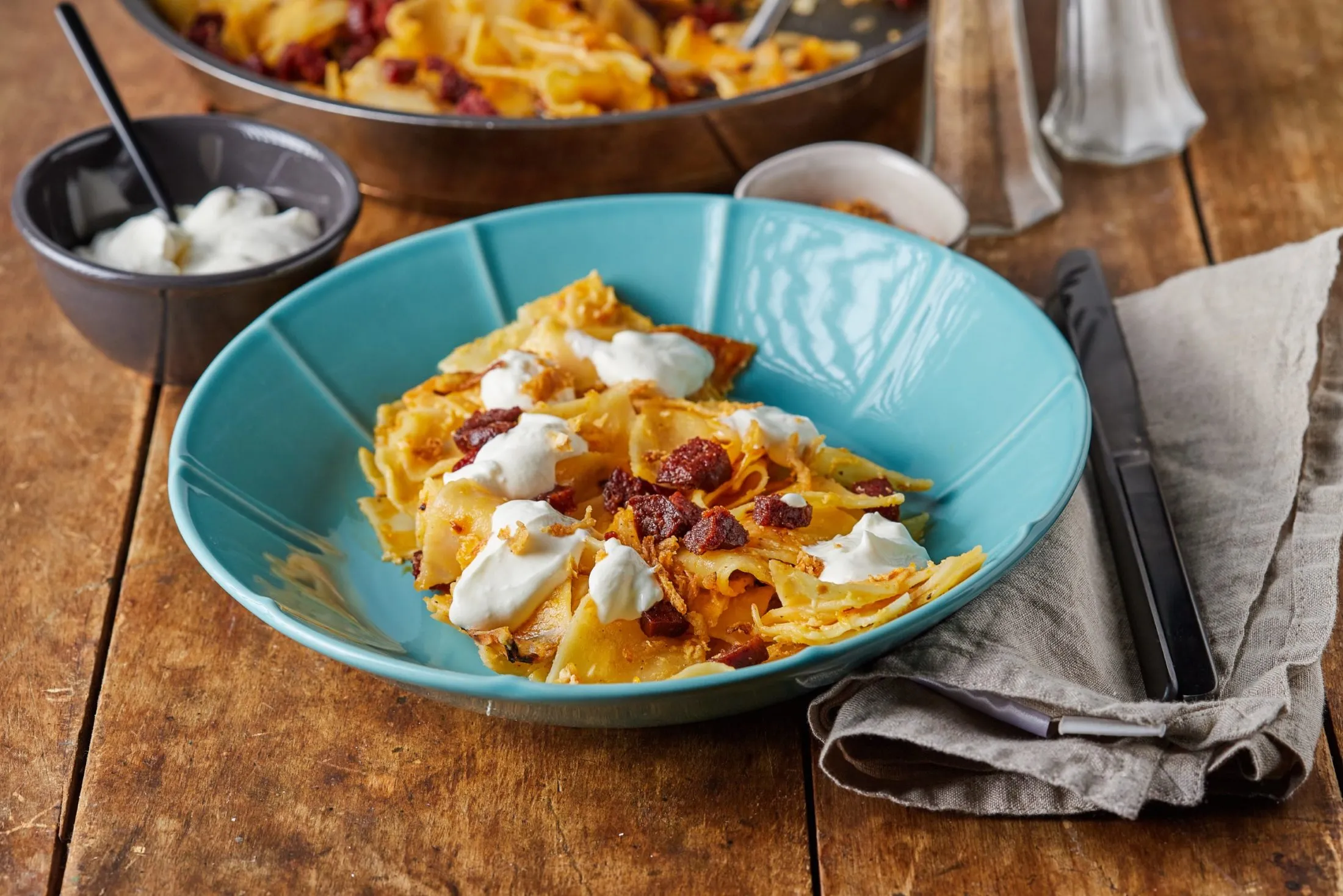 Ezután hozzákeverjük a juhtúrót, ha kell, megsózzuk, és tejföllel, a ropogós kolbásszal, valamint pirított hagymával tálaljuk.