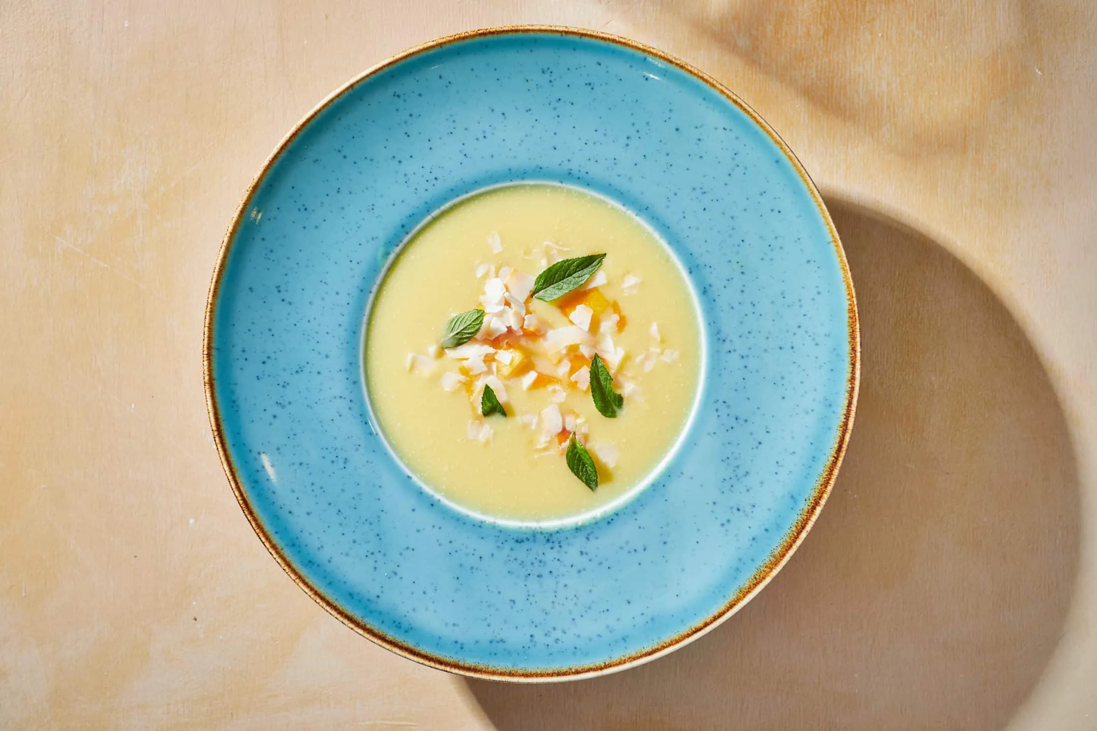 Akár melegen, de inkább jól lehűtve fogyasszuk. Tálaláskor beletesszük a kis kockára vágott barackot, megszórjuk kókuszchipsszel és friss mentalevéllel díszítjük.
