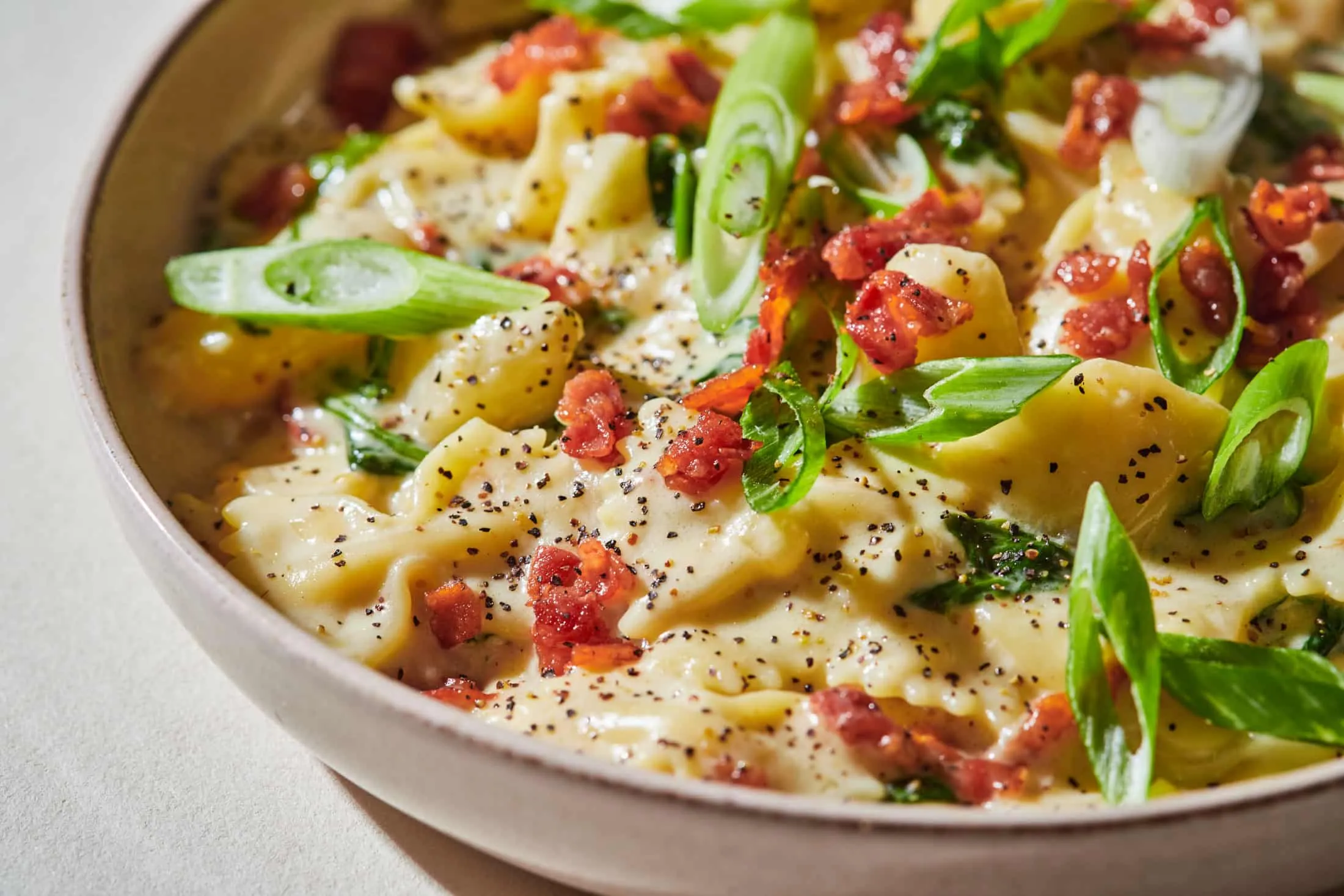 Addig főzzük, amíg a bor el nem párolog, ekkor felöntjük a tejszínnel, hozzáadjuk a spenótot és kb. 3 percig főzzük. Ha esetleg a tejszín nem sűrűsödött volna be kellően, akkor a keményítőt kikeverjük a vízzel, és ezzel sűrítjük a szószt (a tejszíntől függ, hogy szükséges-e). Belefacsarjuk a citrom levét, végül pedig összeforgatjuk a tésztával és a bacon felével. Tálalásnál megszórjuk a karikára vágott újhagymával, a maradék baconnel és a borssal.