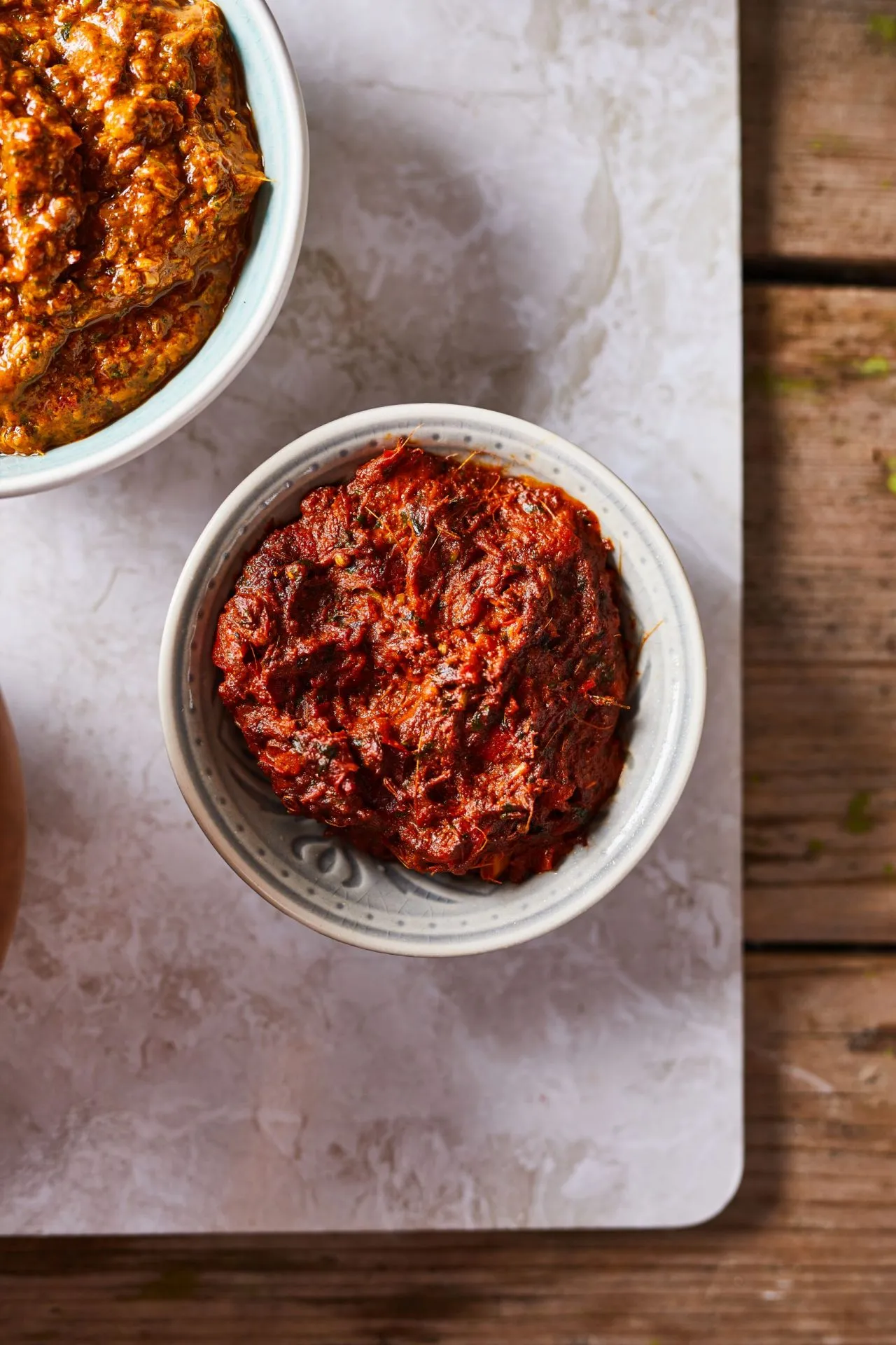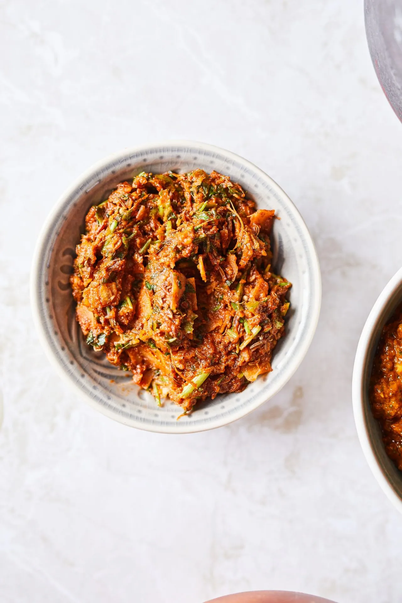 A köménymagot és a koriandermagot egy száraz serpenyőben addig pirítjuk, amíg illatozni nem kezd. A fokhagymát, a gyömbért, a csilit és a friss koriandert apróra vágjuk. Az összes többi hozzávalóval együtt az egészet vagy egy mozsárban vagy egy aprítógépben lezúzzuk, és kész is.