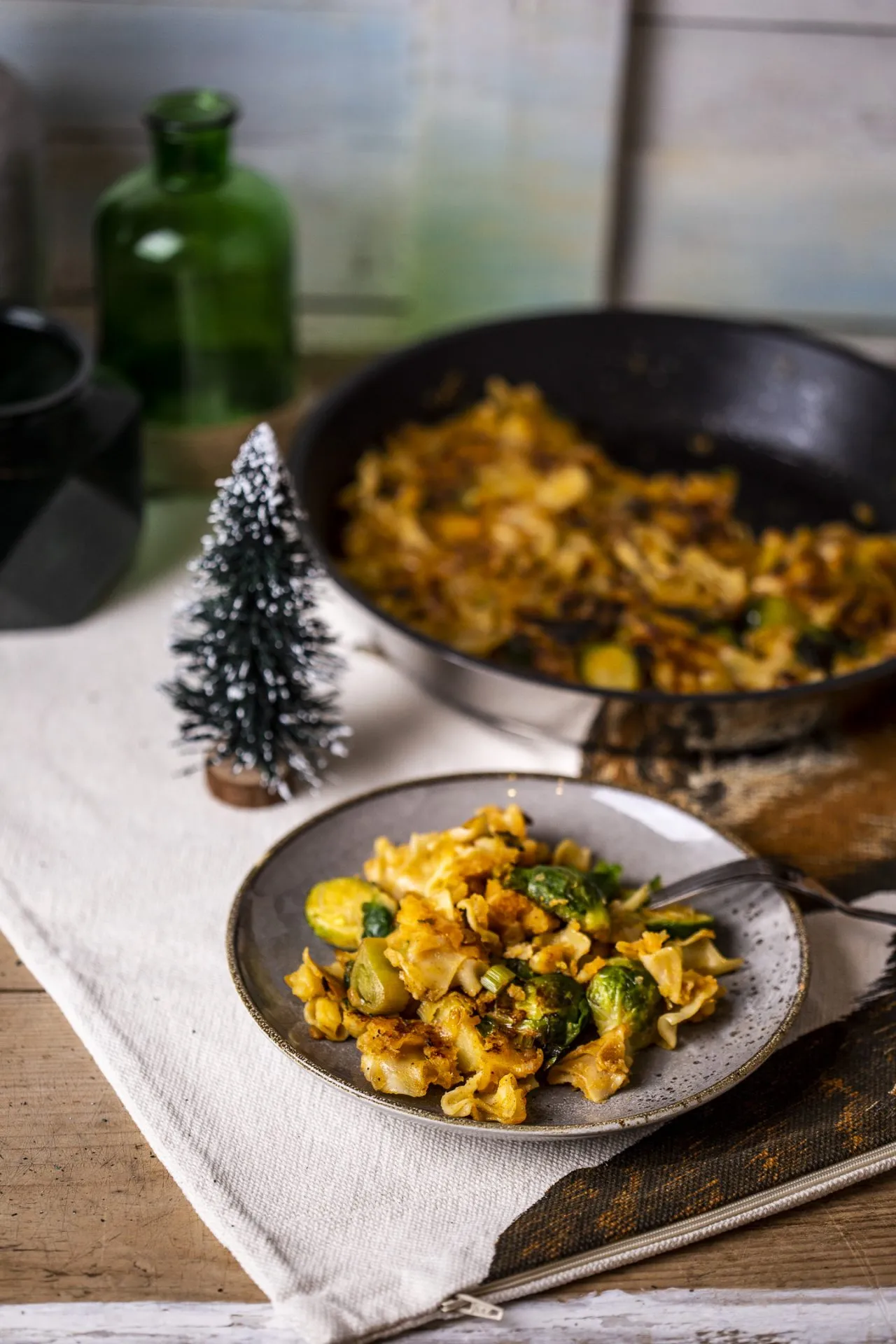 Sós vízben feltesszük főni a felkockázott krumplit. Egy serpenyőben kevés olajon aranybarnára pirítjuk a felaprított hagymát, póréhagymát, fokhagymát. Sózzuk, borsozzuk és megszórjuk a felaprított friss fűszerekkel. Ezután rászedjük a forró főtt krumplit és kanalazunk rá a főzőléből is, megszórjuk pirospaprikával és egy krumplinyomóval alaposan áttörjük az egészet a serpenyőben. A kelbimbó tönkjeit levágjuk, elfelezzük és sós vízben a tésztával együtt addig főzzük, amíg a tészta meg nem puhul, ezután leszűrjük. Rádobjuk a paprikás-krumplis alapra, meglocsoljuk olívaolajjal és alaposan lenyomkodjuk egy villával, majd lepirítjuk az egészet , néhányszor átforgatjuk és ha szépen odapirult, kész is.
