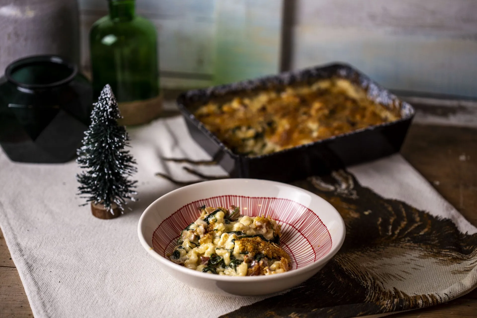 Egy serpenyőben zsírjára pirítjuk a felaprított bacont és közben rádobjuk a felszeletelt fokhagymát. Rárakjuk a spenótot, sózzuk, borsozzuk, átkeverjük. Ha a spenót összeesett, rászórjuk a reszelt sajt nagy részét (hagyunk picit a tetejére) és a keményítőt, majd felöntjük a tejszínnel és összeforraljuk. Hozzáadjuk a megfőtt galuskát és jól összeforgatjuk. Átkanalazzuk egy tepsibe, megszórjuk a maradék sajttal és a zsemlemorzsával. 200 fokra előmelegített sütőben addig sütjük, amíg meg nem pirul a teteje.