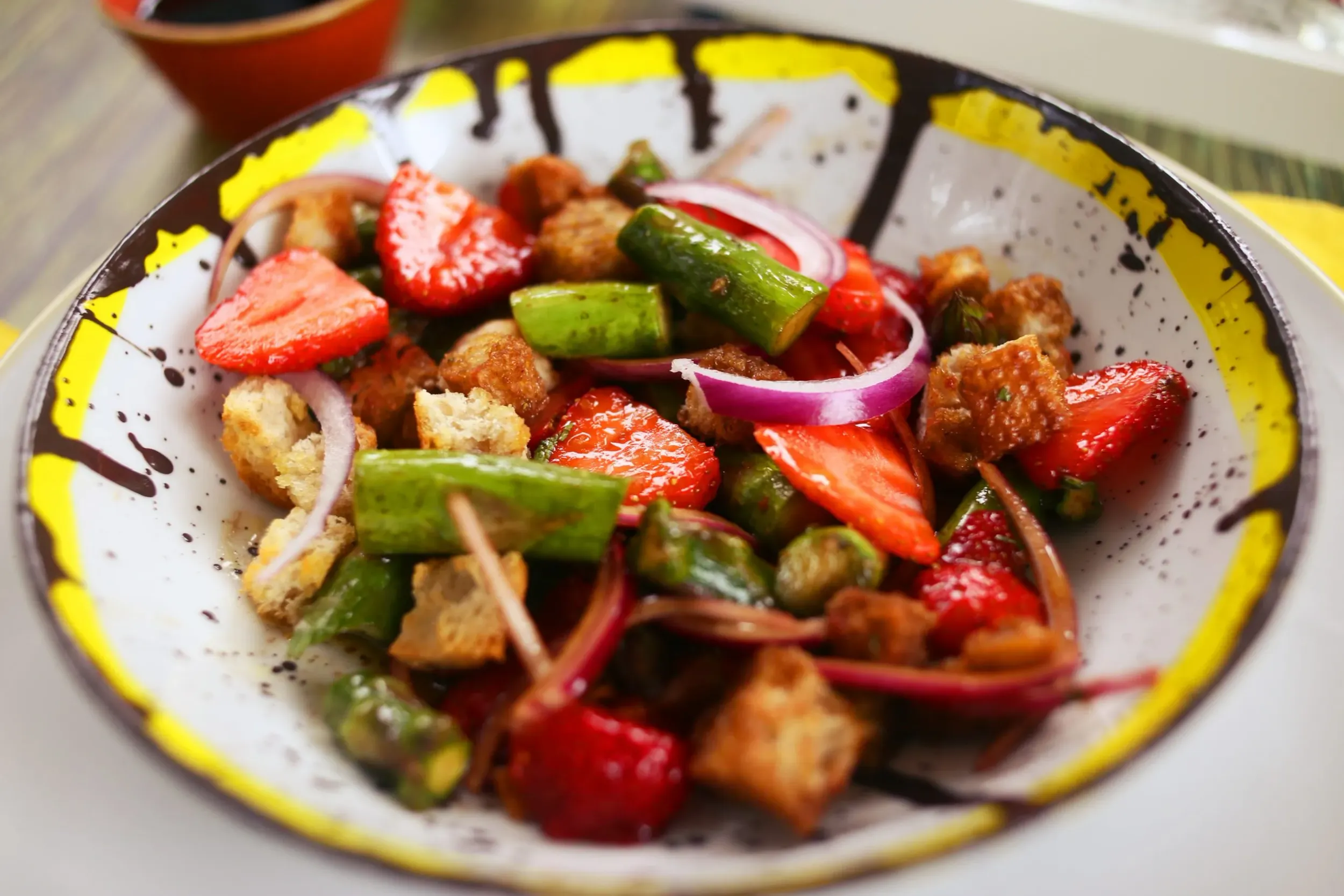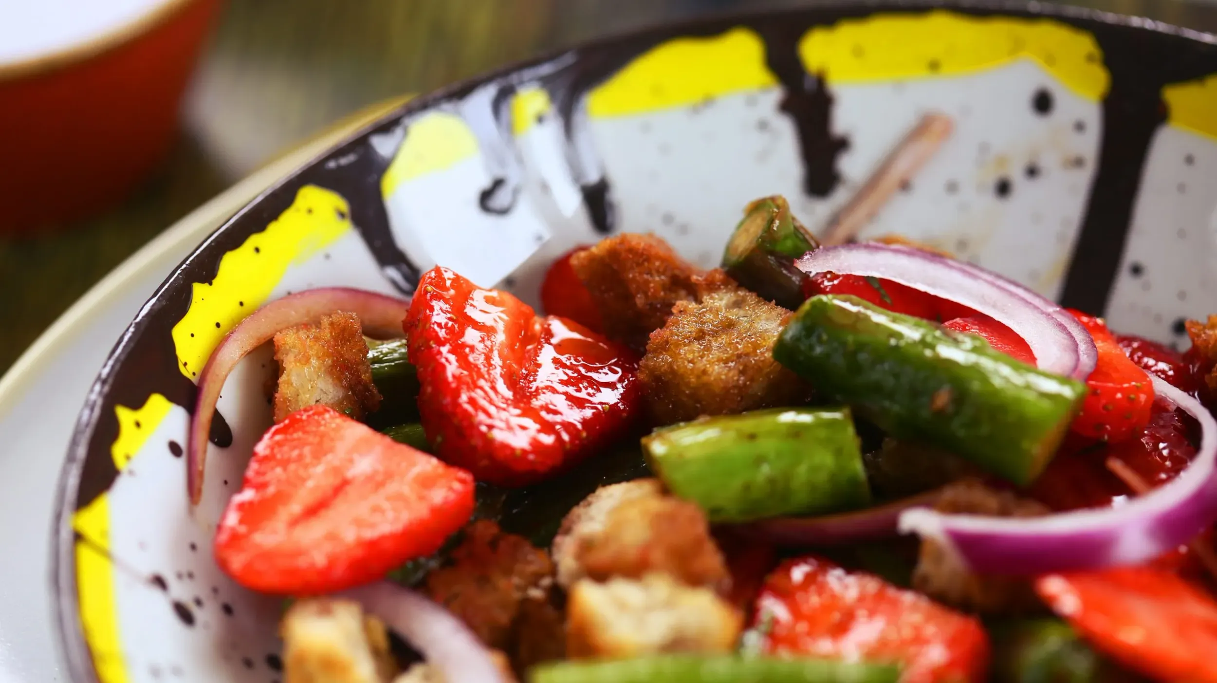 Először előkészítjük a spárgákat: az alsó fás részt egy egyszerű mozdulattal letörjük, ezután kisebb darabokra vágjuk a többi részét. A kenyeret kis kockákra vágjuk, tepsibe pakoljuk, meglocsoljuk olívaolajjal és 200 C-on kb. 10 perc alatt megpirítjuk. A vajat felhevítjük, rádobjuk a spárgadarabokat, sózzuk, borsozzuk és kb. 3 perc alatt átpirítjuk őket. Összekeverjük az olívaolajat, balzsamecetet és aprított mentalevelet.
