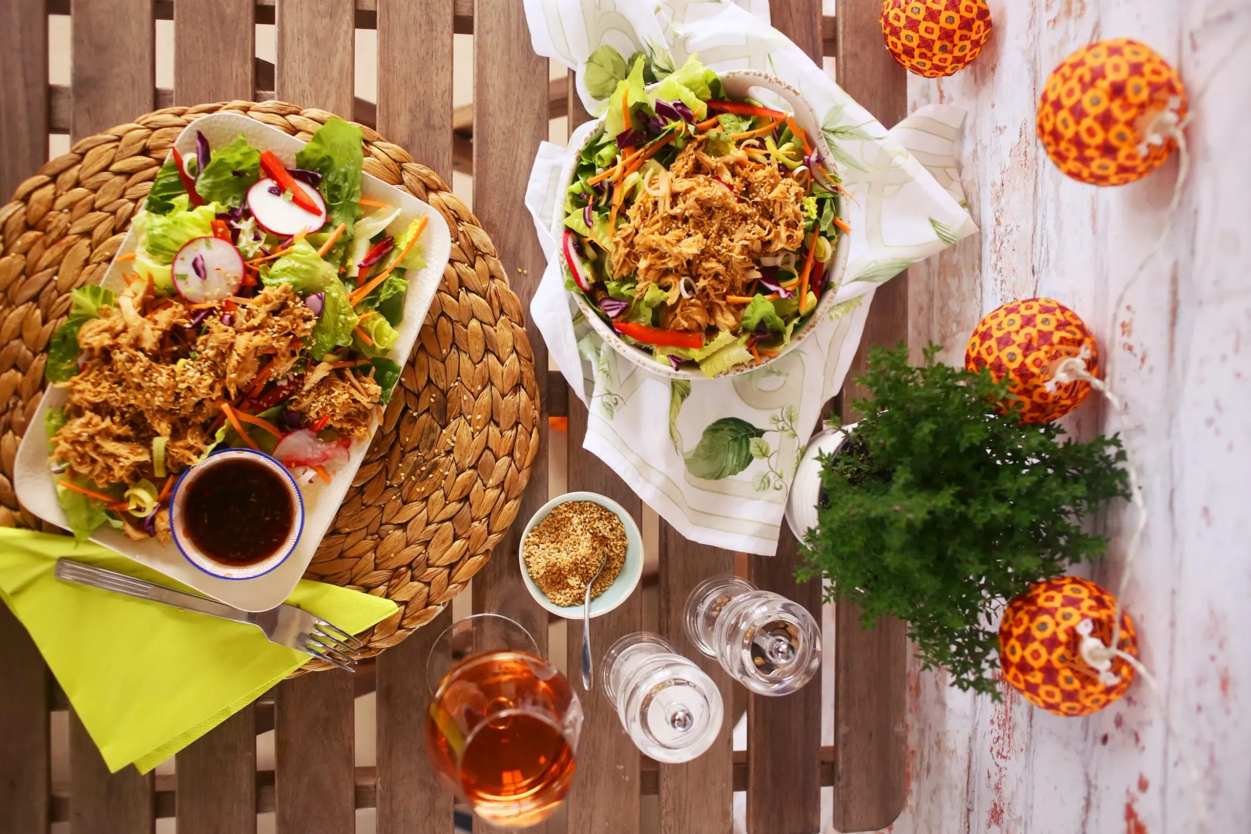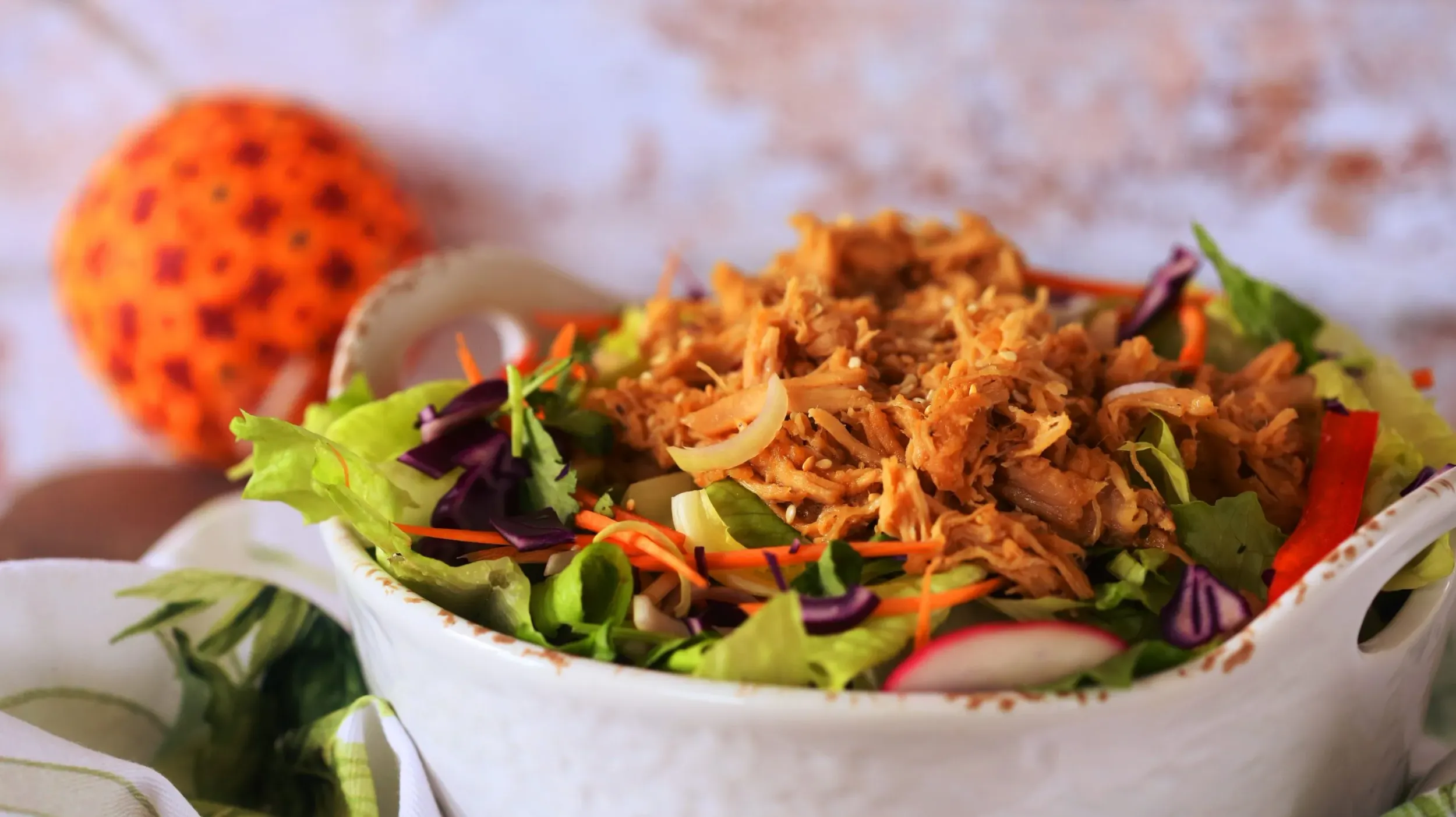 A csirkemellett, forró sós vízbe pottyantjuk és kb. 25 perc alatt megfőzzük. A római salátát pár kisebb darabra vágjuk. A répát és a lilakáposztát vékony csíkokra, a retket és az újhagymát szeletekre vágjuk. A kaliforniai paprikát is felszeleteljük és az aprított korianderrel együtt a többi alapanyaghoz dobjuk.