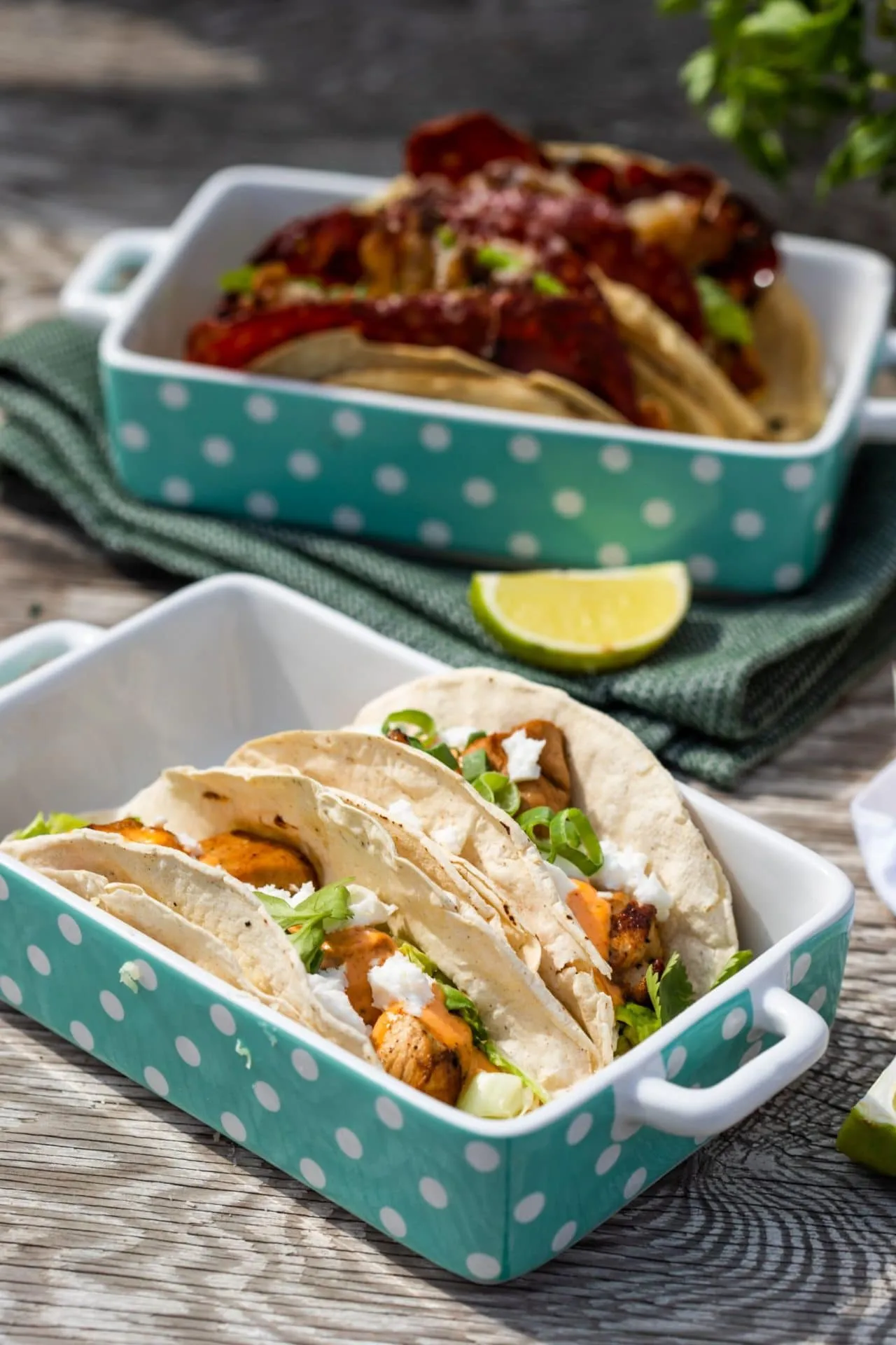 Két tortillalap kell egy tacóhoz, egymásba fogjuk őket, és ebbe kerül a lecsöpögtetett káposzta, rá a csirke, meglocsoljuk a szósszal, majd morzsolt fetát és apróra vágott újhagymát szórunk rá.