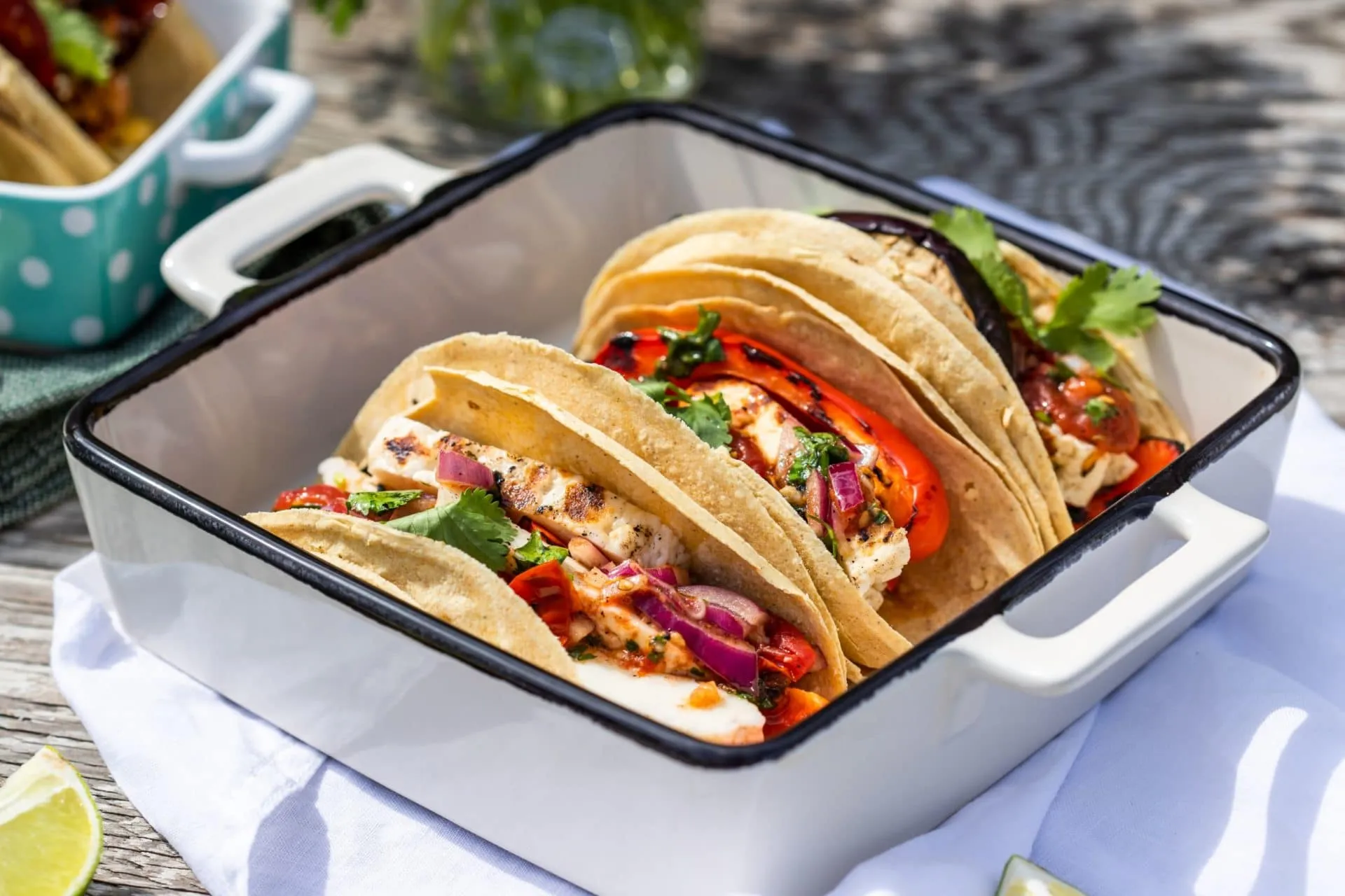 A halloumi sajtot felszeleteljük és meggrillezzük. A tortillalapokat visszamelegítjük, de nem pirítjuk meg. Két tortillalap kell egy tacóhoz, egymásba fogjuk őket, és ebbe kerül a háromféle grillzöldség, a grillsajt és a salsa.
