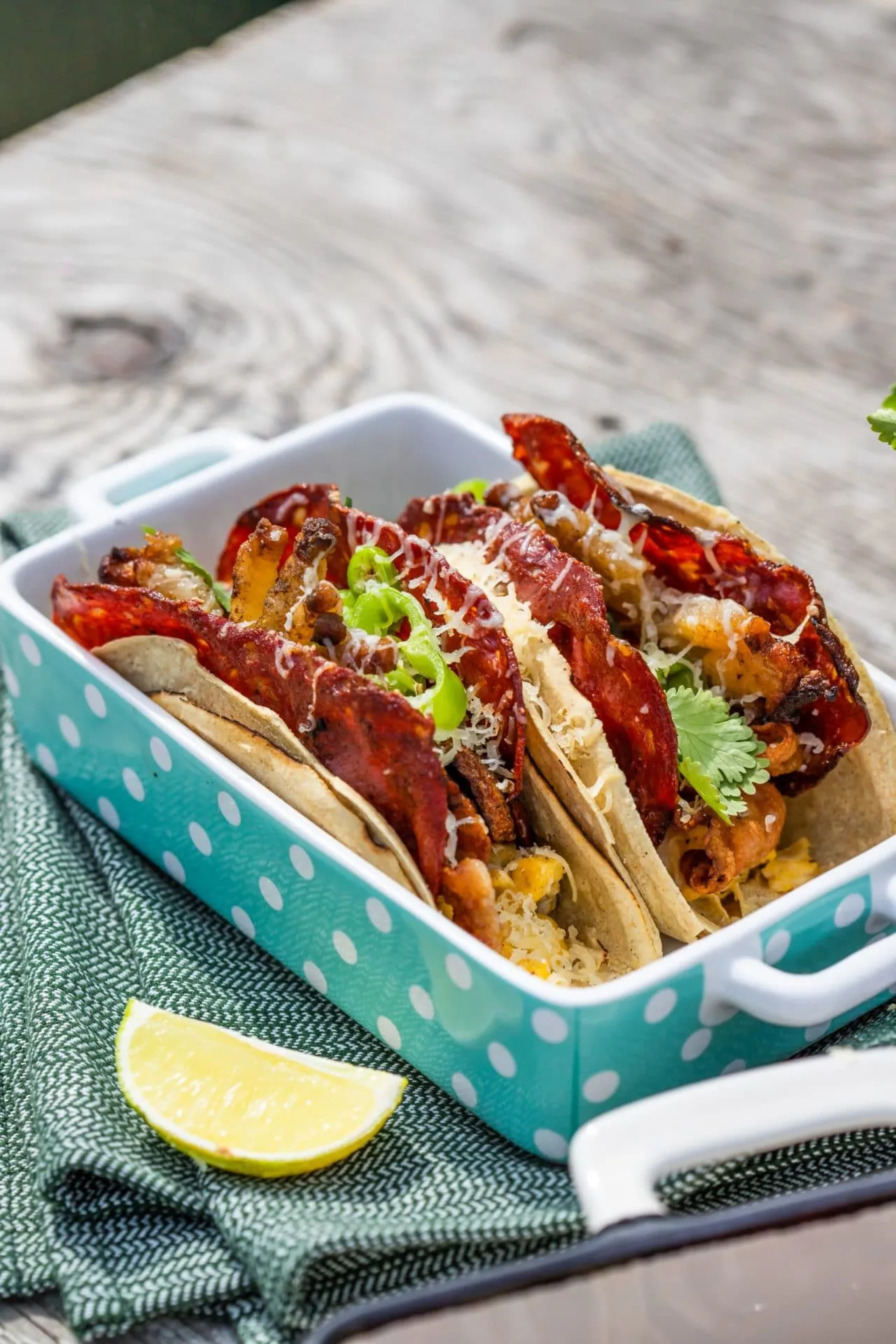 Két tortillalap kell egy tacóhoz, egymásba fogjuk őket, és ebbe kerül rántotta, a chorizo, a bacon, a szalonna, valamint a pirított kolbász, végül kis juharszirupot csorgatunk rá, újhagymát és hegyes erős paprikát szeletelünk rá, és kevés reszelt cheddar sajttal fejezzük be.