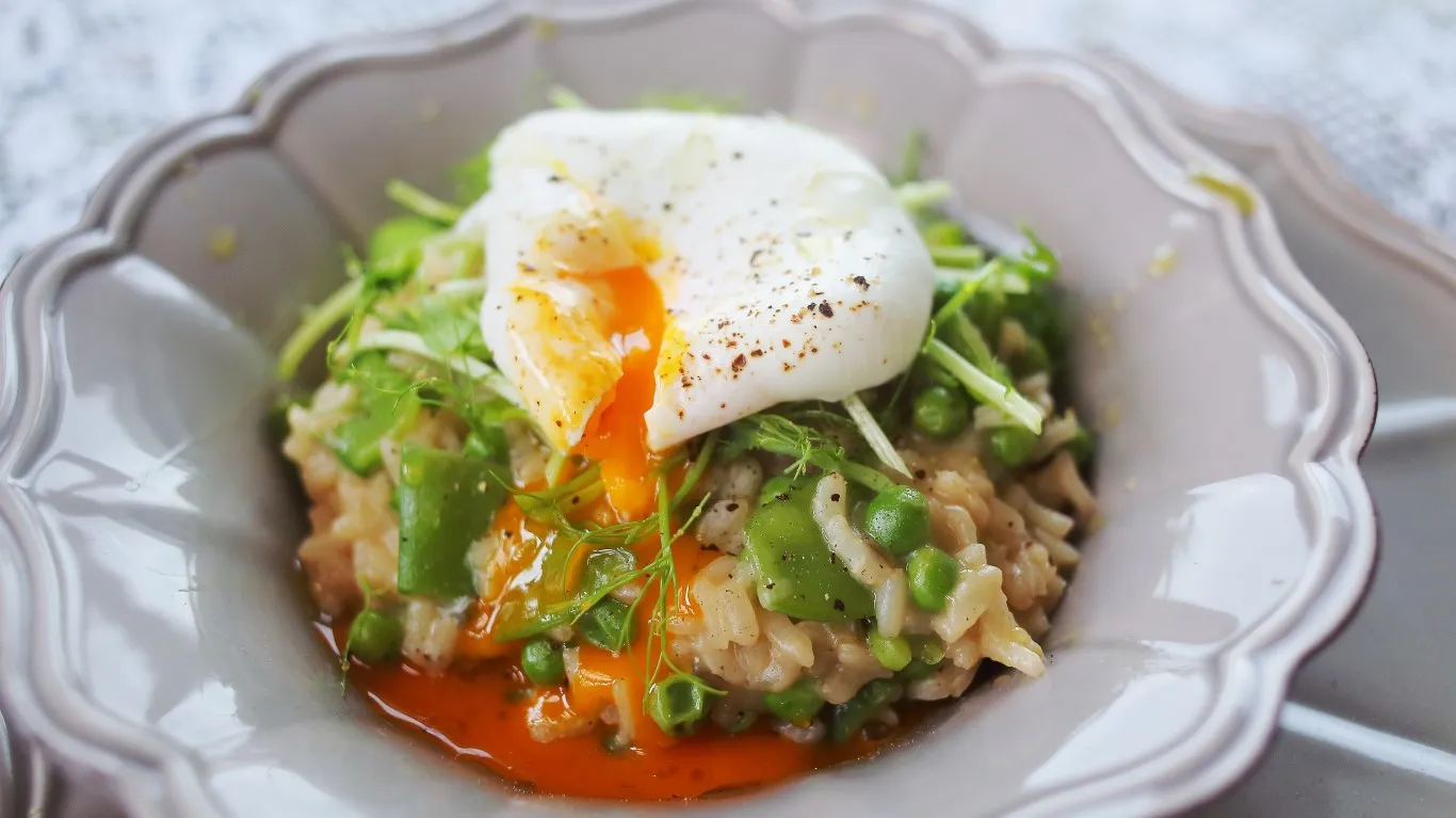 A tálalás a következőképpen néz ki: egy adag rizottó, a tetejére egy pár zöldborsócsíra, végül pedig egy tojás.