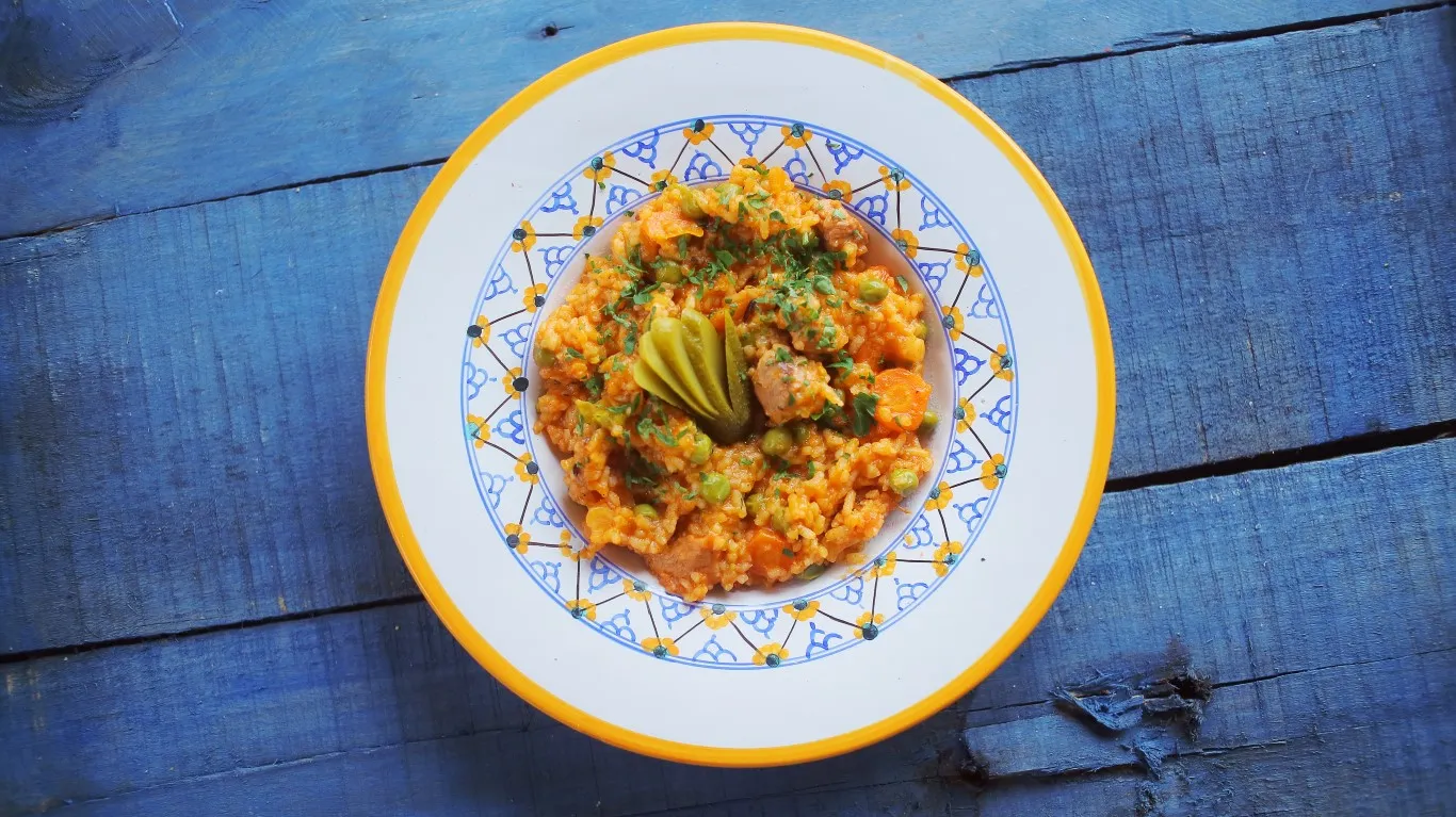 Az olajon lepirítjuk a finomra vágott hagymát és fokhagymát. A paprikát és a paradicsomot nagyobb darabokra vágjuk és a hagymás alaphoz adjuk. Megsózzuk és puhára pároljuk. A felkockázott húst is hozzáadjuk és lepirítjuk. Amikor kifehéredett a hús, beletesszük a köményt és a fűszerpaprikát. Lassú lángon hagyjuk hogy a hús levet eresszen, majd megsózzuk és felöntjük egy kis vízzel, lefedjük és közepes lángon puhára főzzük, úgy hogy folyamatosan pótoljuk a folyadékot. Mikor a hús már majdnem puhára főtt, hozzáadjuk a rizset, a feldarabolt petrezselyemgyökeret és sárgarépát, valamint a zöldborsót. Alaposan összekeverjük, felöntjük vízzel és teljesen puhára főzzük. Végül aprított petrezselyemmel és csemegeuborkával tálaljuk.