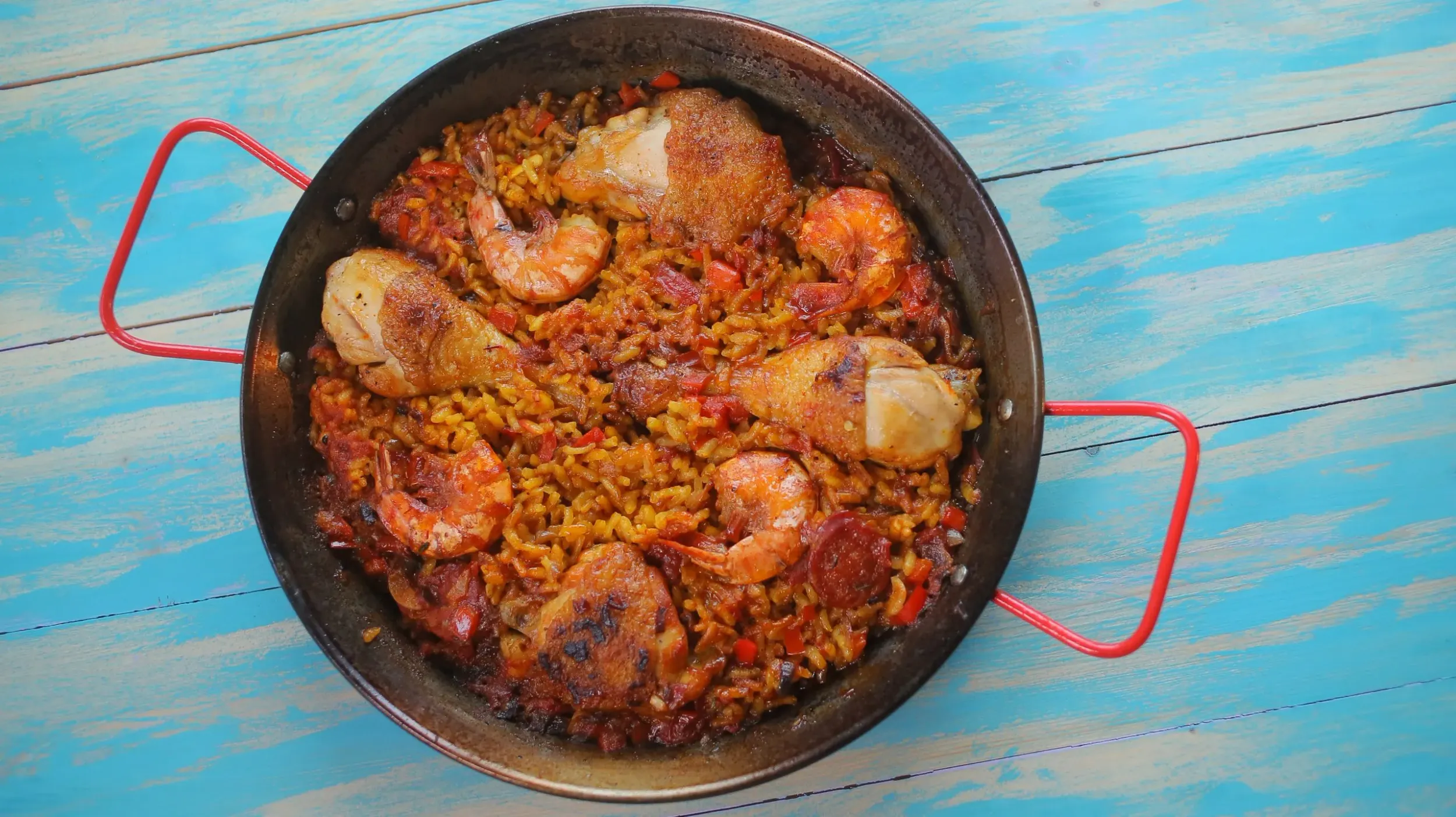 A félbevágott csirkéket megsózzuk, megborsozzuk. A serpenyőben olívaolajat forrósítunk és bőrös oldalukkal lefelé elkezdjük lesütni benne a húsdarabokat, úgy hogy néha fordítunk rajta egyet, közepesre vesszük a lángot. Eközben a lilahagymát, paprikát és fokhagymát finomra aprítjuk. Amikor a húsok, kb. 20 perc alatt megsültek, a serpenyő oldalára toljuk őket és középre öntjük a hagymát. Ha üvegesre pirult, hozzáadjuk a paprikát és a fokhagymát, hagyjuk egy pár percet pirulni, majd mehet bele a vékony karikákra vágott chorizo. Felöntjük a passzírozott paradicsommal, sózzuk, borsozzuk, megszórjuk a kakukkfűvel és a fűszerpaprikával. Alaposan összekeverjük, elrendezzük a csirke darabokat, megszórjuk egyenletesen a rizzsel, azt pedig a sáfránnyal és végül a húsok közé helyezzük a garnélákat. Legvégül meglocsoljuk az alaplével. Addig főzzük, amíg az a garnélák rózsaszínűek nem lesznek, a rizsszemek beszívták a folyadékot, az alja pedig egy kicsit lepirult.