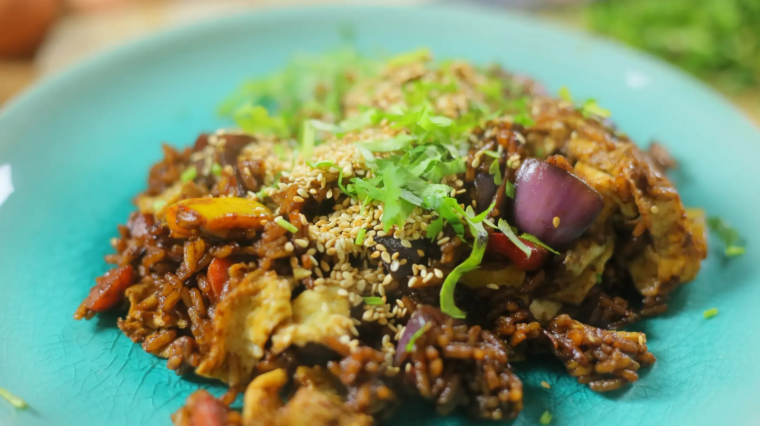 Egy száraz wokban aranybarnára pirítjuk a szezámmagot, majd félretesszük. A wokba öntjük az étolajat és ha felforrósodott, akkor beleöntjük a felvert tojást, amit szétoszlatunk rajta, mint egy palacsintát. A tojást egy deszkára kiszedjük, feltekerjük és kis csíkokra vágjuk. A wokban pirítani kezdjük a vékony karikákra vágott fokhagymát, chilit és a csíkokra vágott gyömbért. Amikor elkezdett illatozni hozzáadjuk a durvára vágott répát, hagymát és paprikát. Hozzáadjuk a barnacukrot, szójaszószt és végül a bambuszrügyeket. Az egészet 1-2 percig pirítjuk majd hozzákeverjük a főtt rizst és a tojásos csíkokat. Tálaláskor megszórjuk a pirított szezámmaggal és friss korianderrel.