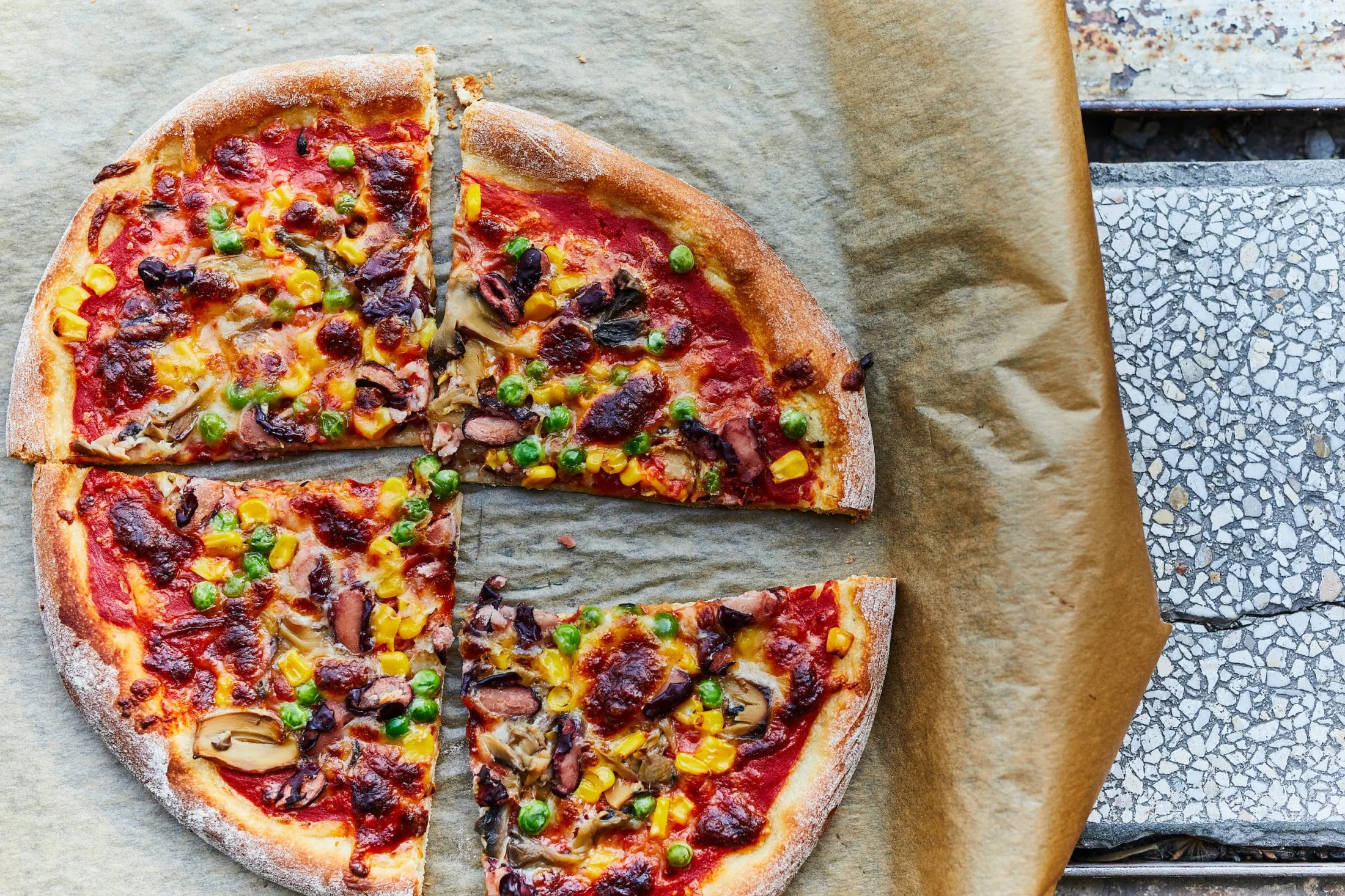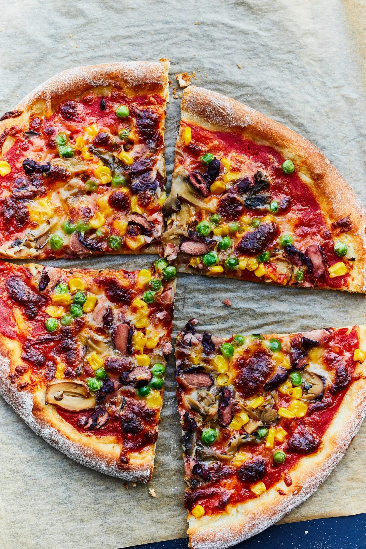 Ha megkelt, kinyújtuk a tésztákat, és sütőpapírral bélelt tepsire tesszük őket. Megkenjük a passatával, rátesszük a reszelt sajtot, megszórjuk 1-1 marék babbal, borsóval, gombával és kukoricával. 230 fokra előmelegített sütőben 10-15 perc alatt készre sütjük.